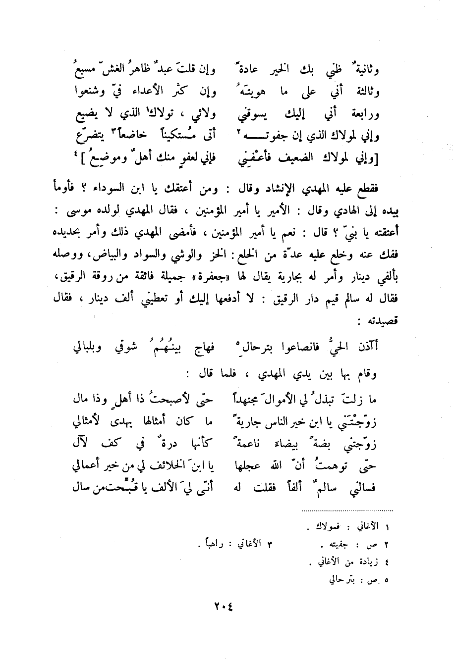 " وإني لمولاك الضعيف فأعفني ... فإني لعفو منك أهل وموضع " (4) فقطع عليه المهدي الإنشاد وقال: ومن أعتقك يا ابن السوداء؟ فأومأ بيده إلى الهادي وقال: الأمير يا أمير المؤمنين، فقال المهدي لولده موسى: أعتقه يا بني؟ قال نعم يا أمير المؤمنين فأمضى المهدي ذلك وأمر بحديده ففك عنه وخلع عليه عدّة من الخلع: الخز والوشي والسواد والبياض، ووصله بألفي دينار وأمر له بجاري يقال لها " جعفرة " جميلة فائقة من روقة الرقيق، فقال له سالم قيم دار الرقيق: لا أدفعها إليك أو تعطيني ألف دينار، فقال قصيدته: