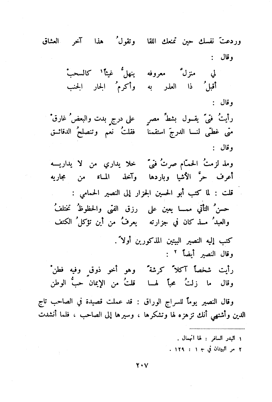 وقال ما زلت محباً لها ... قلت من الإيمان حب الوطن وقال النصير يوماً للسراج الوراق: قد عملت قصيدة في الصاحب تاج الدين وأشتهي أنك تزهزه لها وتشكرها، وسيرها إلى الصاحب، فلما أنشدت