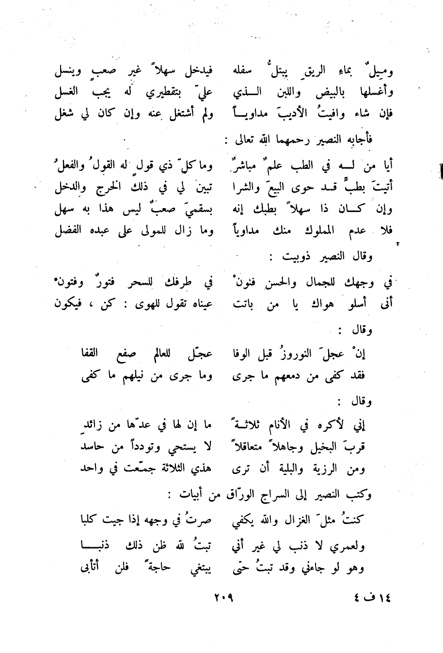 فإن شاء وافيت الأديب مداوياً ... ولم أشتغل عنه وإن كان لي شغل فأجابه النصير رحمهما الله تعالى: