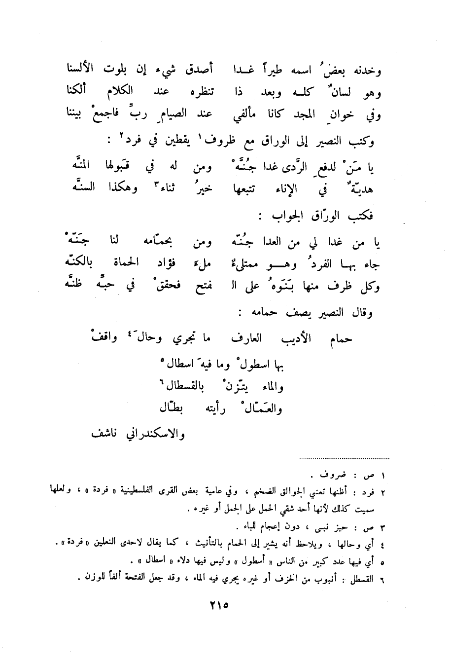 حمام الأديب العارف ... ما تجري وحال (4) واقف بها اسطول وما فيه اسطال (5) ... والماء يتزن بالقسطال (6) ... والمال رأيته بطال ... والاسكندراني ناشف ...