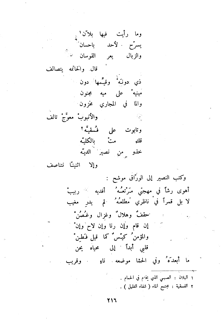 وما رأيت فيها بلان (1) ... يسرح لأحد باحسان ... والزبال يعر القوسان ... قال والهاتمه يتصالف ... ذي دونه وقيمها دون ... مبنيه على ميه مجنون ... والما في المجاري مخزون ... والأنبوب معوج تالف ... وتابوت على فسقيه (2) ... قلتو مت بالكليه ... خذو من نصير الديه ... وإلا اثنينا نتناصف ... وكتب النصير إلى الوراق موشح: