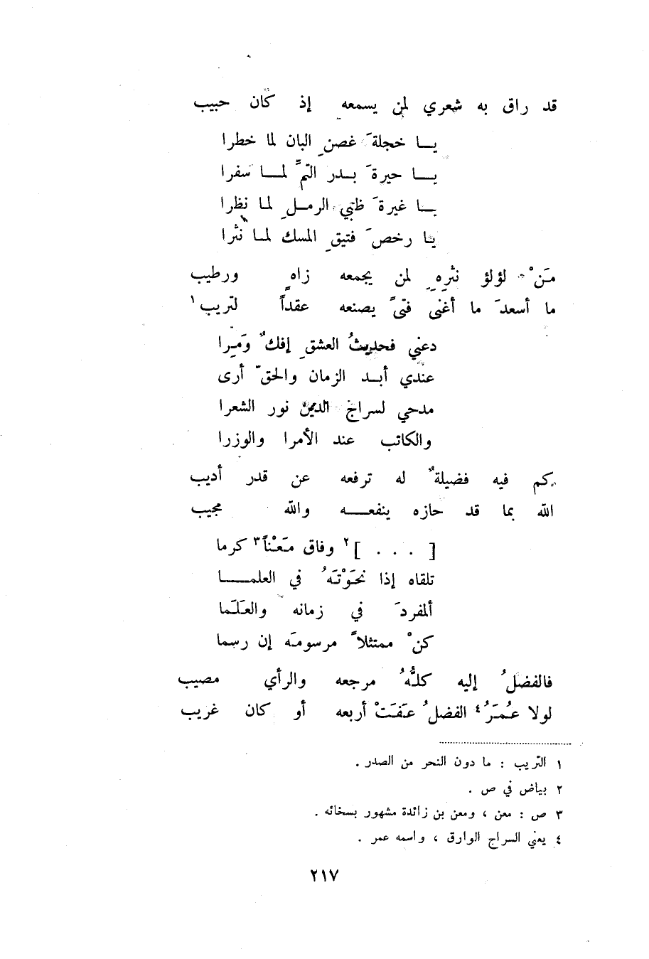 قد راق به شعري لمن يسمعه ... إذ كان حبيب يا خجلة غصن البان لما خطرا ... يا حيرة بدر التم لما سفرا ... يا غيرة ظبي الرمل لما نظرا ... يا رخص فتيق المسك لما نثرا ...