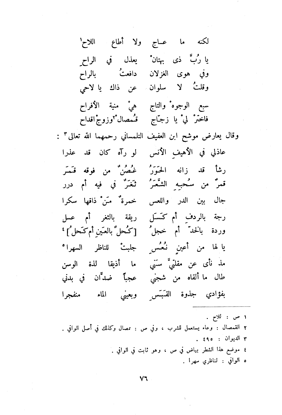 فاختر لي يا زجاج ... قمصال (2) وزوج أقداح وقال يعارض موشح ابن العفيف التلمساني رحمهما الله تعالى (3) :