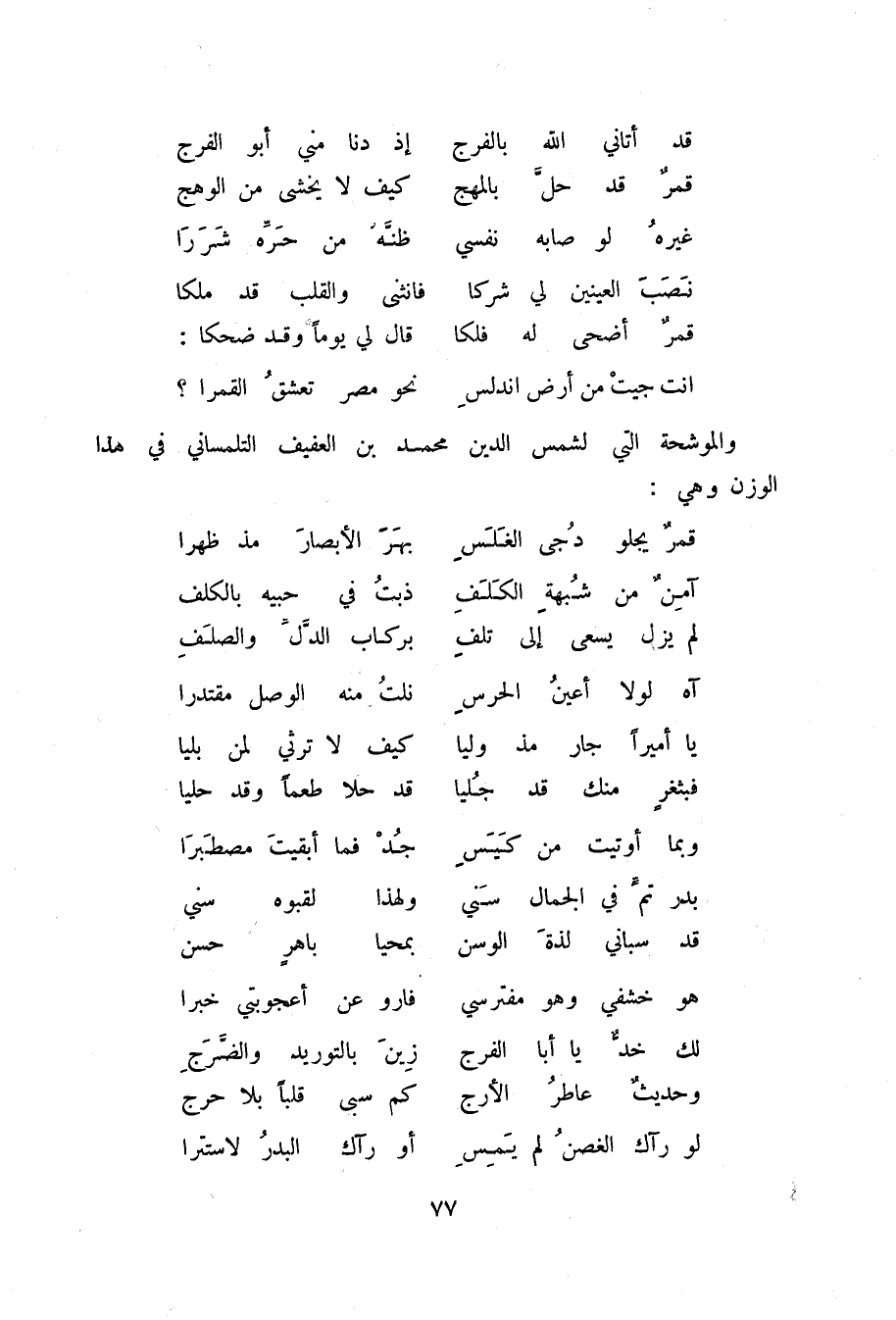أنت جيت من أرض اندلس ... نحو مصر تعشق القمرا؟ والموشحة التي لشمس الدين محمد بن العفيف التلمساني في هذا الوزن وهي: