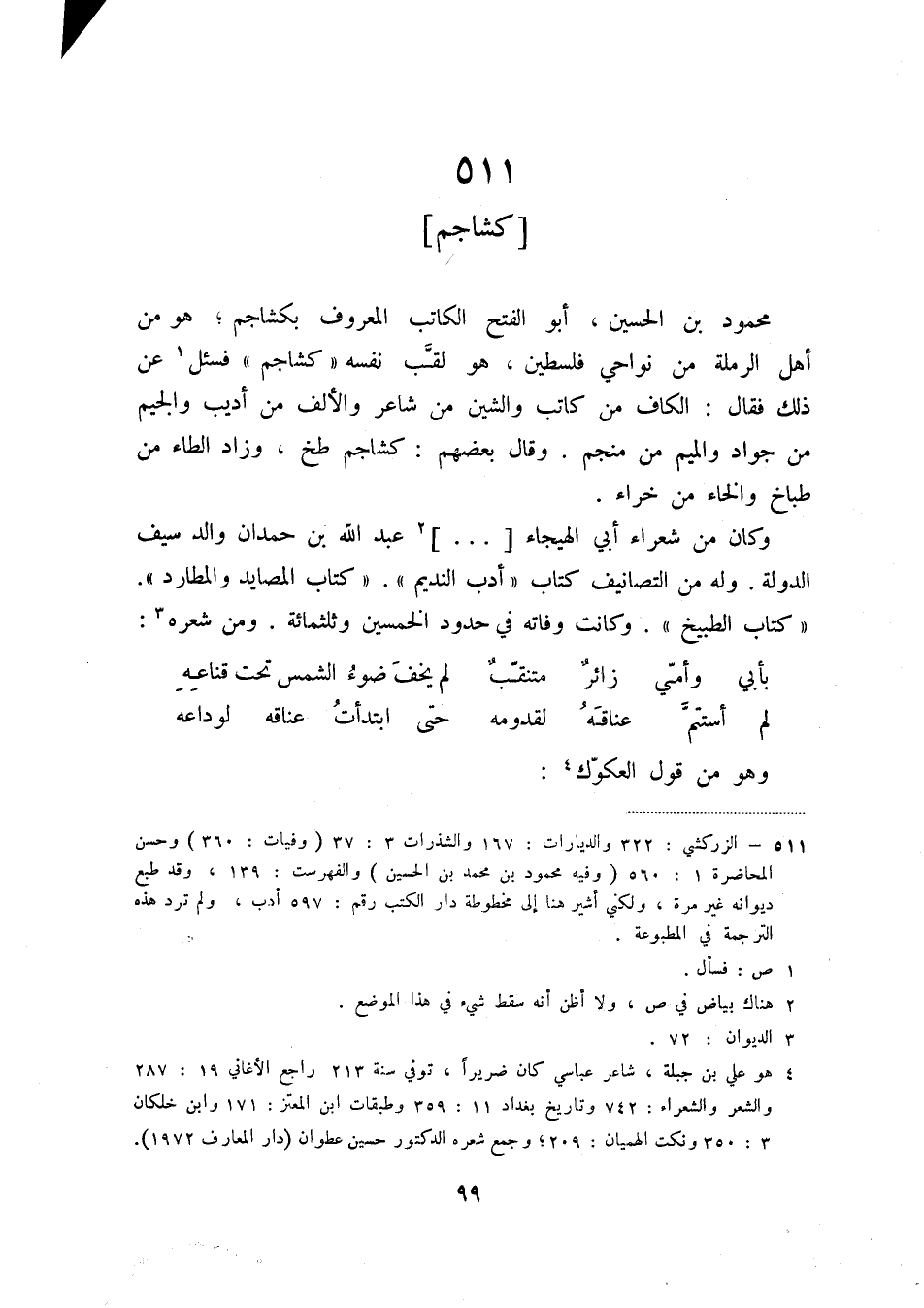 (1) الزركشي: 322 والديارات: 167 والشذرات 3: 37 (وفيات: 360) وحسن المحاضرة 1: 560 (وفيه محمود بن محمد بن الحسين) والفهرست: 139، وقد طبع ديوانه غير مرة، ولكني أشير هنا إلى مخطوطة دار الكتب رقم: 597 أدب، ولم ترد هذه الترجمة في المطبوعة.