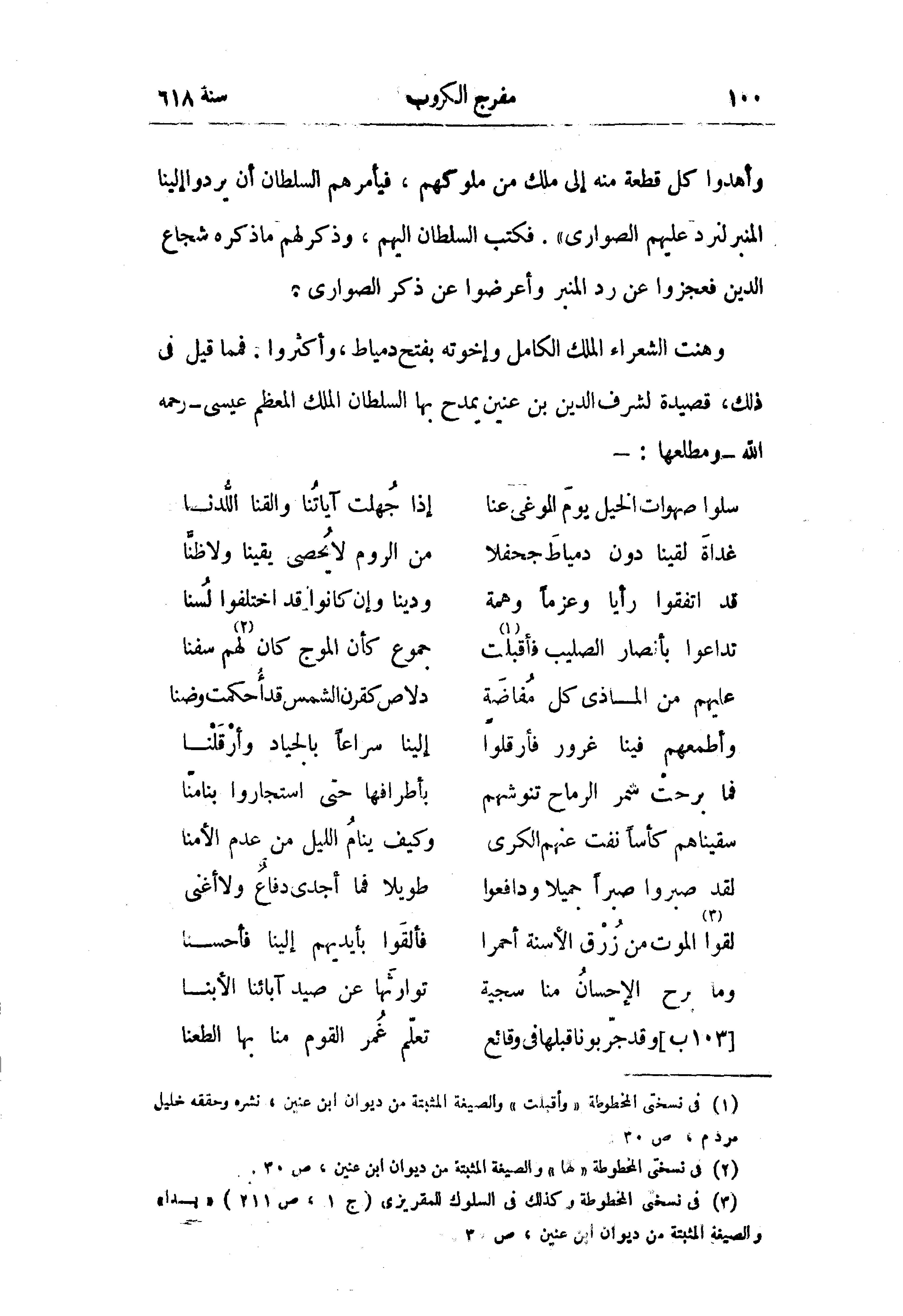 (¬1) في نسختى المخطوطة «وأقبلت» والصيغة المثبتة من ديوان ابن عنين، نشره وحققه خليل مردم، ص 30.