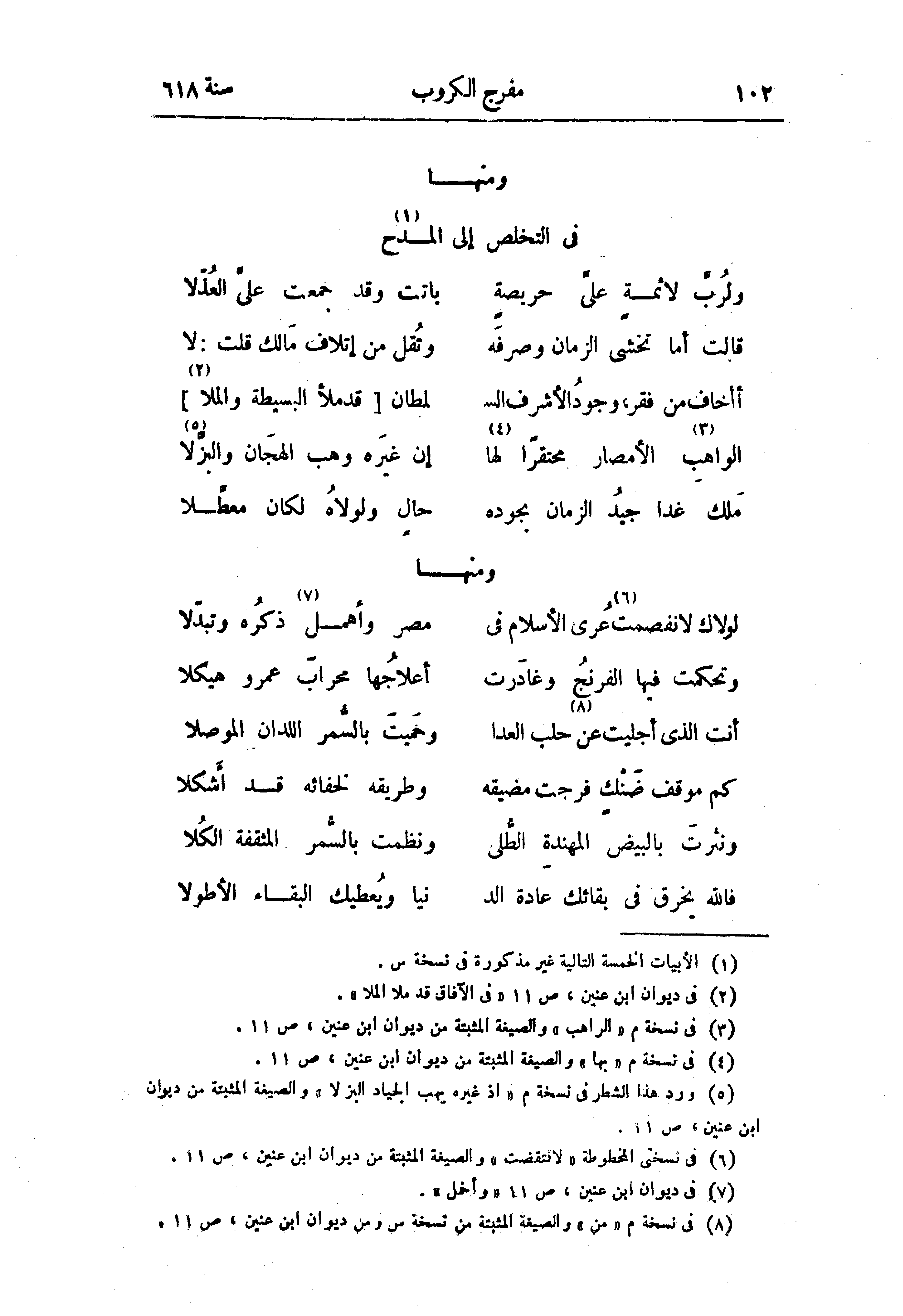 (¬8) في نسخة م «من» والصيغة المثبتة من نسخة س ومن ديوان ابن عنين، ص 11.
