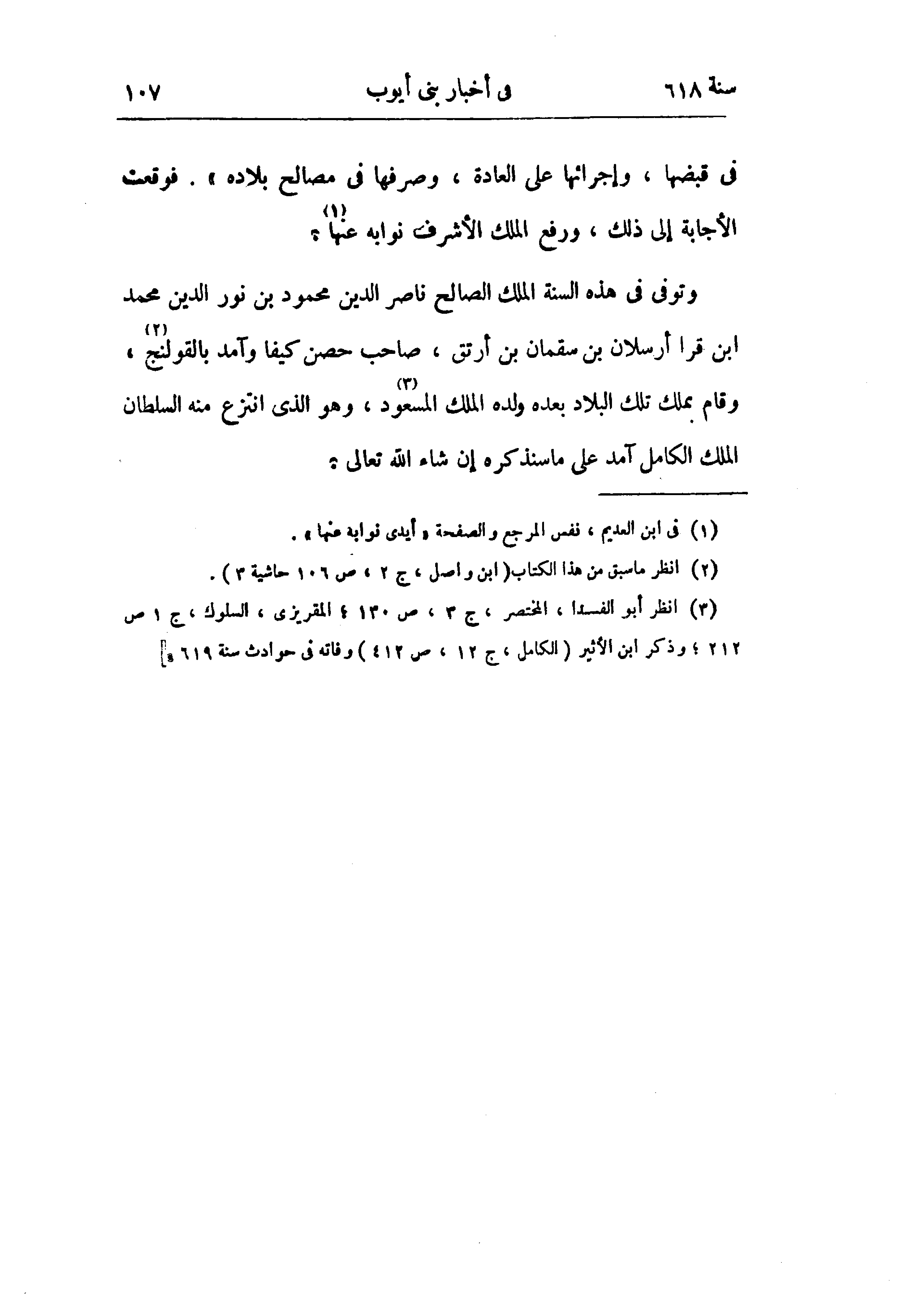(¬3) انظر أبو الفدا، المختصر، ج 3، ص 130؛ المقريزى، السلوك، ج 1 ص 212؛ وذكر ابن الأثير (الكامل، ج 12، ص 412) وفاته في حوادث سنة 619.