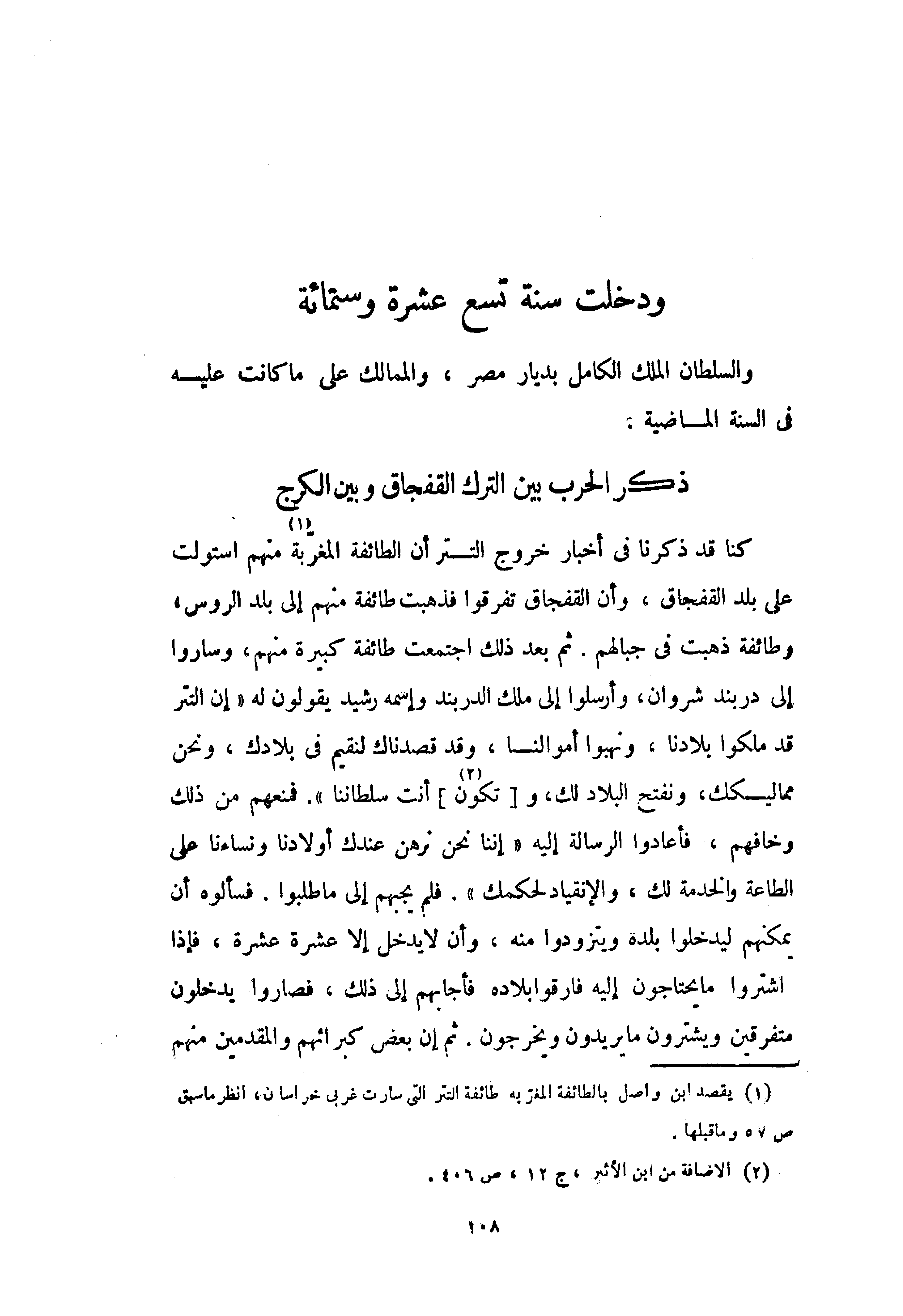 كنا قد ذكرنا في أخبار خروج التتر أن الطائفة المغرّبة (¬1) منهم استولت على بلد القفجاق، وأن القفجاق تفرقوا فذهبت طائفة منهم إلى بلد الروس، وطائفة ذهبت في جبالهم. ثم بعد ذلك اجتمعت طائفة كبيرة منهم، وساروا إلى دربند شروان، وأرسلوا إلى ملك الدربند وإسمه رشيد يقولون له «إن التتر قد ملكوا بلادنا، ونهبوا أموالنا، وقد قصدناك لنقيم في بلادك، ونحن مماليكك، ونفتح البلاد لك، و [تكون (¬2)] أنت سلطاننا». فمنعهم من ذلك وخافهم، فأعادوا الرسالة إليه «إننا نحن نرهن عندك أولادنا ونساءنا على الطاعة والخدمة لك، والإنقياد لحكمك». فلم يجبهم إلى ما طلبوا. فسألوه أن يمكنهم ليدخلوا بلده ويتزودوا منه، وأن لا يدخل إلا عشرة عشرة، فإذا اشتروا ما يحتاجون إليه فارقوا بلاده فأجابهم إلى ذلك، فصاروا يدخلون متفرقين ويشترون ما يريدون ويخرجون. ثم إن بعض كبرائهم والمقدمين منهم