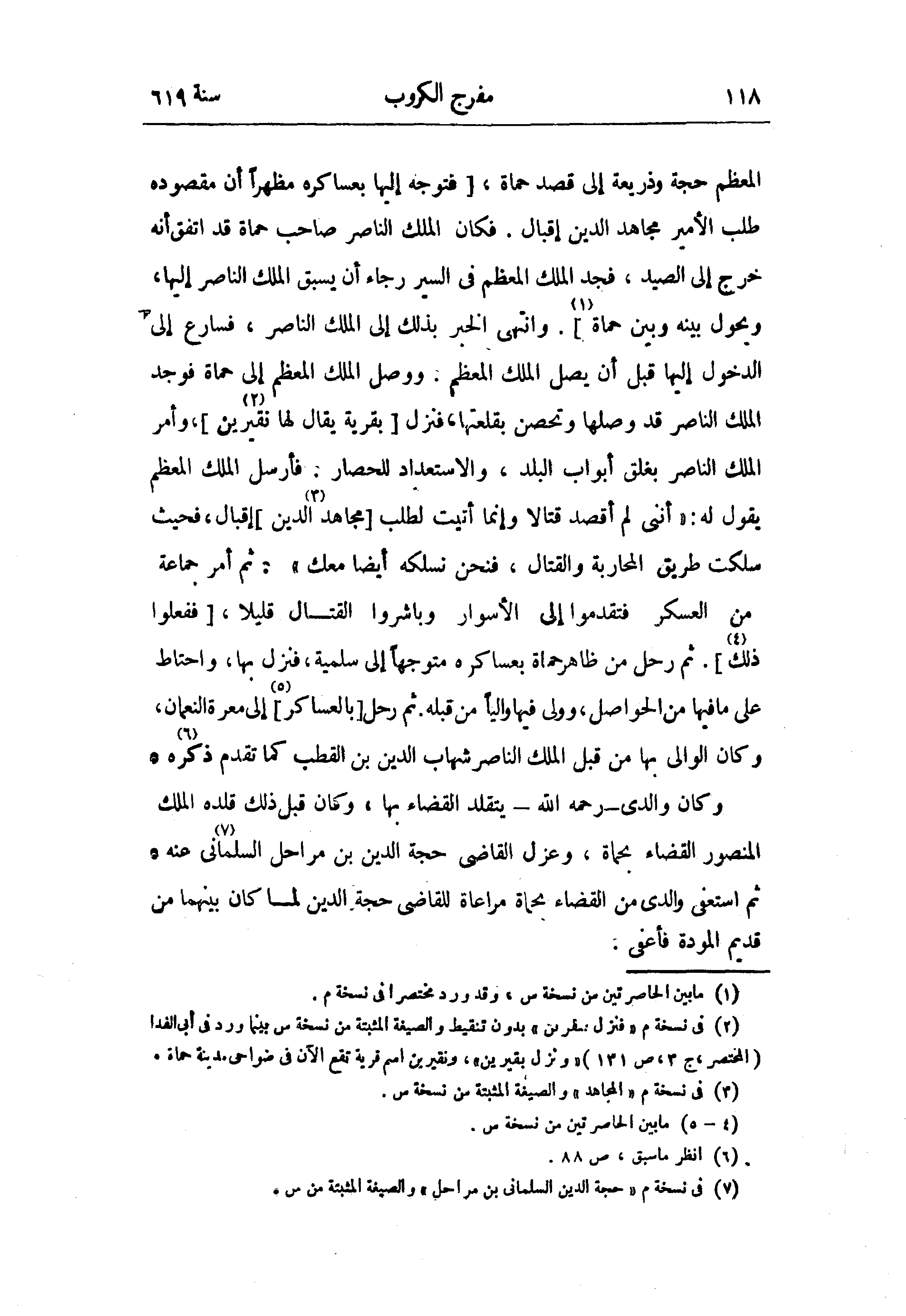 (¬2) في نسخة م «فنزل صقرين» بدون تنقيط والصيغة المثبتة من نسخة س بينما ورد في أبى الفدا (المختصر، ج 3، ص 131) «ونزل بقيرين»، ونقيرين اسم قرية تقع الآن في ضواحى مدينة حماة.