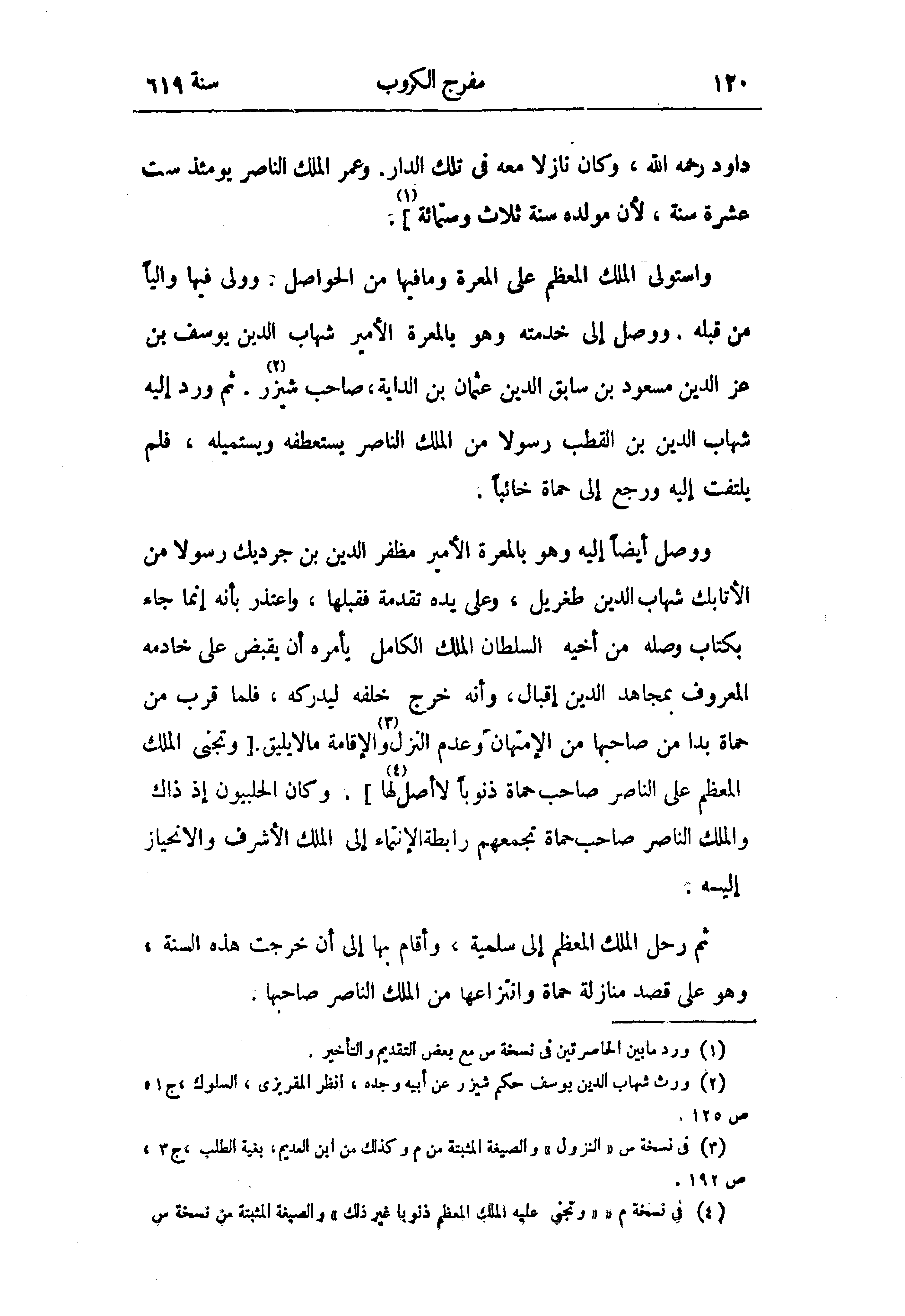 ووصل أيضا إليه وهو بالمعرة الأمير مظفر الدين بن جرديك رسولا من الأتابك شهاب الدين طغريل، وعلى يده تقدمة فقبلها، واعتذر بأنه إنما جاء بكتاب وصله من أخيه السلطان الملك الكامل يأمره أن يقبض على خادمه المعروف بمجاهد الدين إقبال، وأنه خرج خلفه ليدركه، فلما قرب من حماة بدا من صاحبها من الإمتهان وعدم النزل (¬3) والإقامة ما لا يليق. [وتجنى الملك المعظم على الناصر صاحب حماة ذنوبا لا أصل (¬4) لها]. وكان الحلبيون إذ ذاك والملك الناصر صاحب حماة تجمعهم رابطة الإنتماء إلى الملك الأشرف والانحياز إليه.