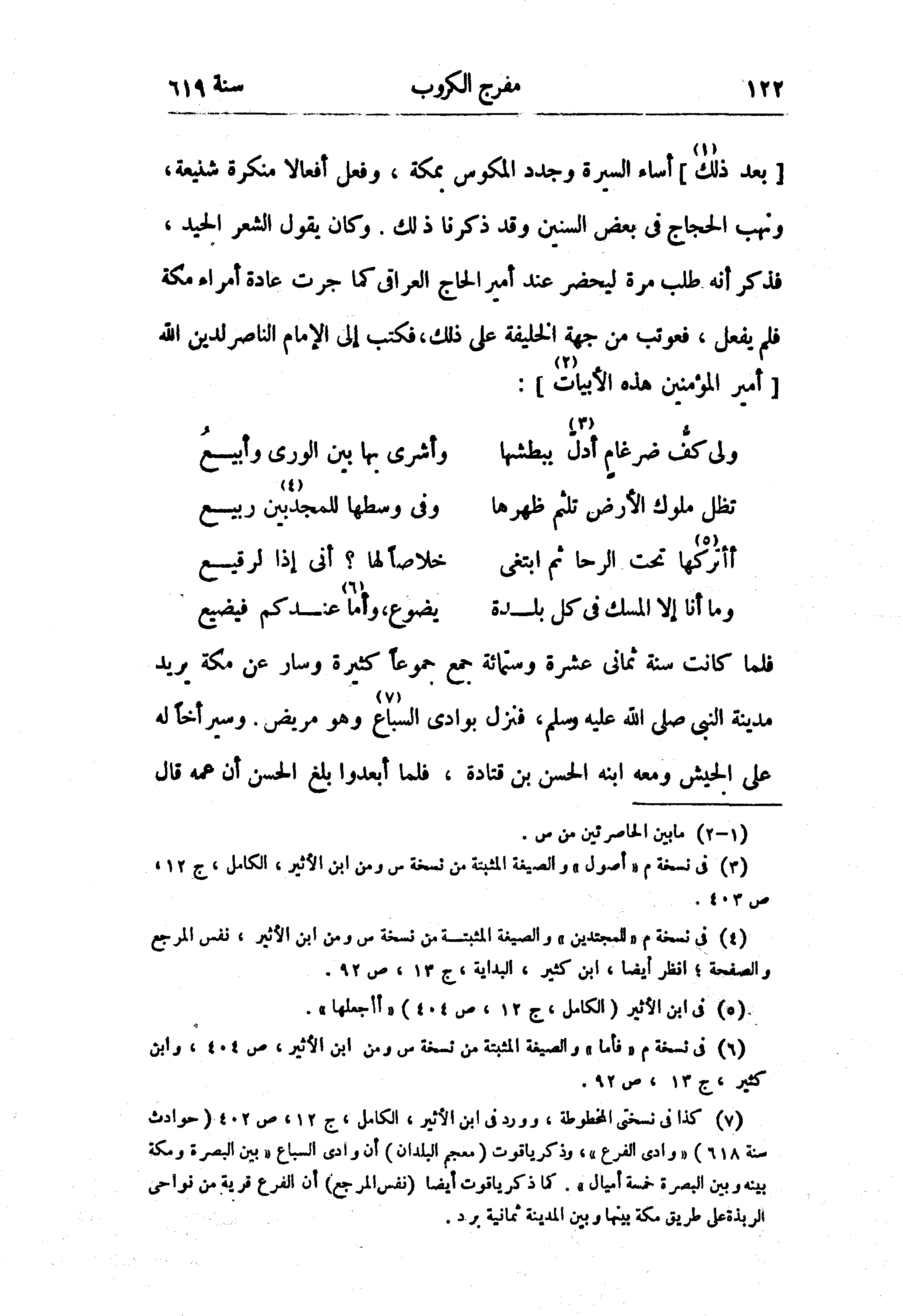 (¬7) كذا في نسختى المخطوطة، وورد في ابن الأثير، الكامل، ج 12، ص 402 (حوادث سنة 618) «وادى الفرع»، وذكر ياقوت (معجم البلدان) أن وادى السباع «بين البصرة ومكة بينه وبين البصرة خمسة أميال». كما ذكر ياقوت أيضا (نفس المرجع) أن الفرع قرية من نواحى الربذة على طريق مكة بينها وبين المدينة ثمانية برد.