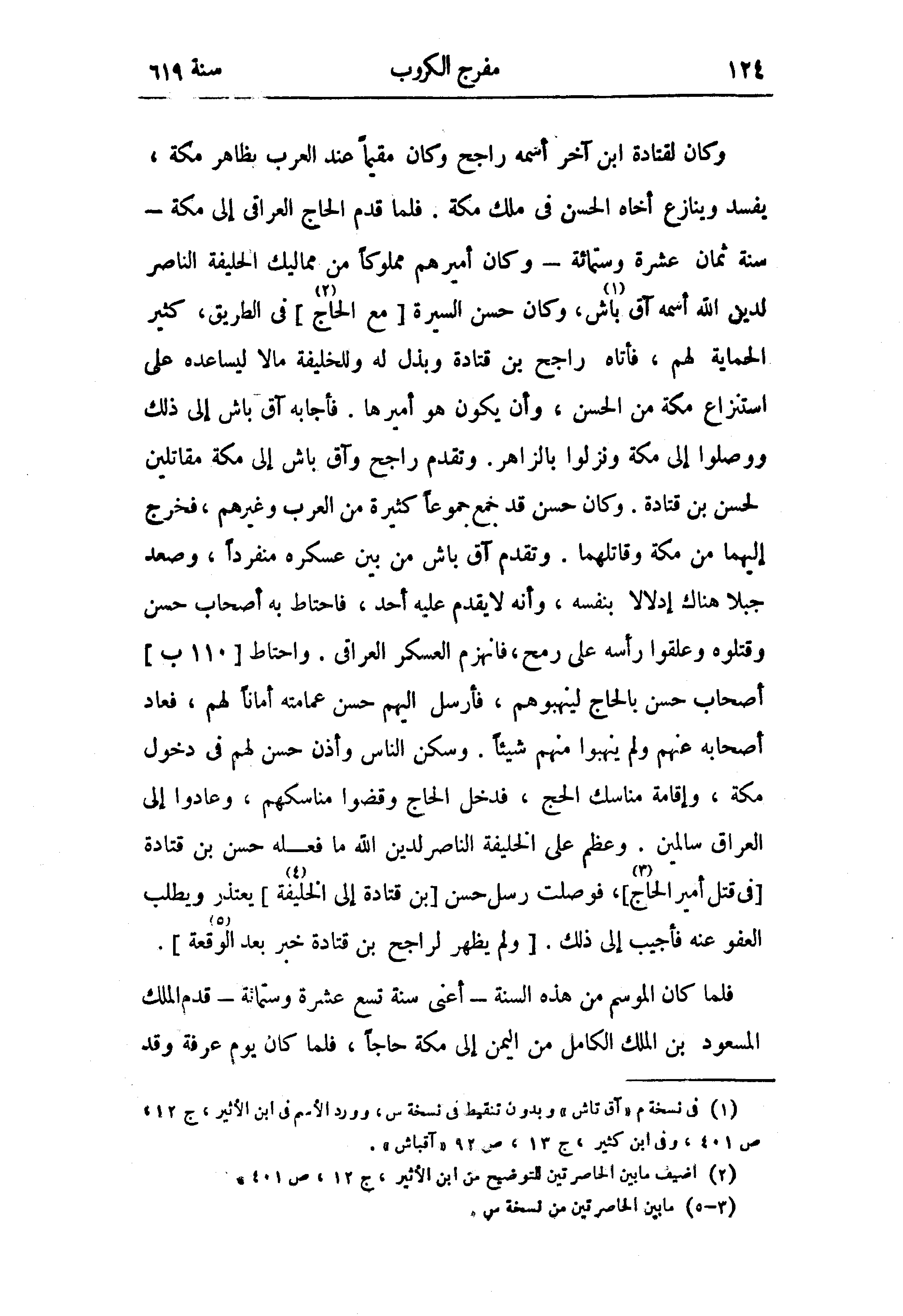 وكان لقتادة ابن آخر أسمه راجح وكان مقيما عند العرب بظاهر مكة، يفسد وينازع أخاه الحسن في ملك مكة. فلما قدم الحاج العراقى إلى مكة - سنة ثمان عشرة وستمائة - وكان أميرهم مملوكا من مماليك الخليفة الناصر لدين الله أسمه آق باش (¬1)، وكان حسن السيرة [مع الحاج (¬2)] في الطريق، كثير الحماية لهم، فأتاه راجح بن قتادة وبذل له وللخليفة مالا ليساعده على استنزاع مكة من الحسن، وأن يكون هو أميرها. فأجابه آق باش إلى ذلك ووصلوا إلى مكة ونزلوا بالزاهر. وتقدم راجح وآق باش إلى مكة مقاتلين لحسن بن قتادة. وكان حسن قد جمع جموعا كثيرة من العرب وغيرهم، فخرج إليهما من مكة وقاتلهما. وتقدم آق باش من بين عسكره منفردا، وصعد جبلا هناك إدلالا بنفسه، وأنه لا يقدم عليه أحد، فاحتاط به أصحاب حسن وقتلوه وعلقوا رأسه على رمح، فانهزم العسكر العراقى. واحتاط [110 ب] أصحاب حسن بالحاج لينهبوهم، فأرسل اليهم حسن عمامته أمانا لهم، فعاد أصحابه عنهم ولم ينهبوا منهم شيئا. وسكن الناس وأذن حسن لهم في دخول مكة، وإقامة مناسك الحج، فدخل الحاج وقضوا مناسكهم، وعادوا إلى العراق سالمين. وعظم على الخليفة الناصر لدين الله ما فعله حسن بن قتادة [في قتل أمير الحاج (¬3)]، فوصلت رسل حسن [بن قتادة إلى الخليفة (¬4)] يعتذر ويطلب العفو عنه فأجيب إلى ذلك. [ولم يظهر لراجح بن قتادة خبر بعد الوقعة (¬5)].