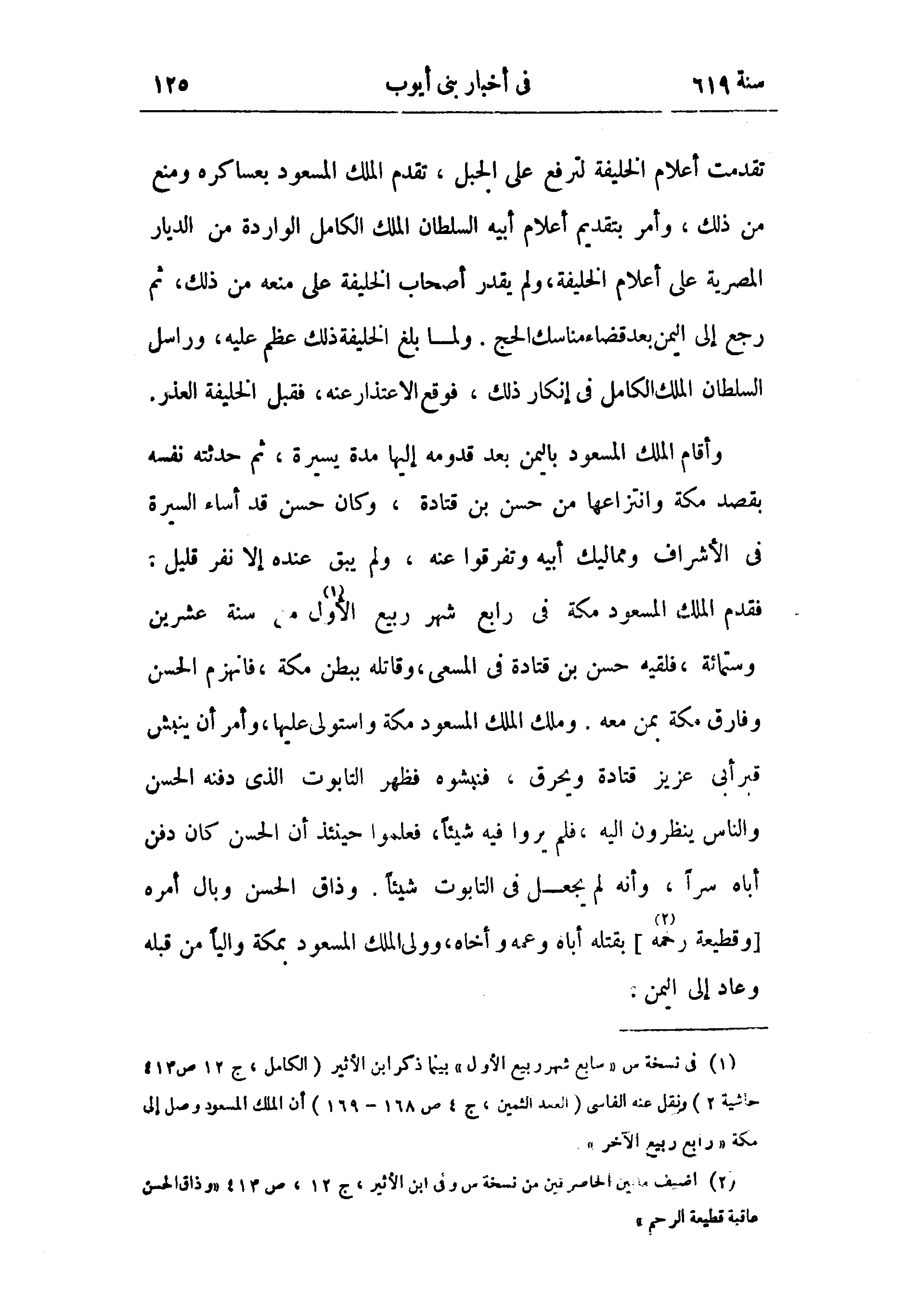 (¬1) في نسخة س «سابع شهر ربيع الأول» بينما ذكر ابن الأثير (الكامل، ج 12 ص 413 حاشية 2) ونقل عنه الفاسى (العقد الثمين، ج 4 ص 168 - 169) أن الملك المسعود وصل إلى مكة «رابع ربيع الآخر».