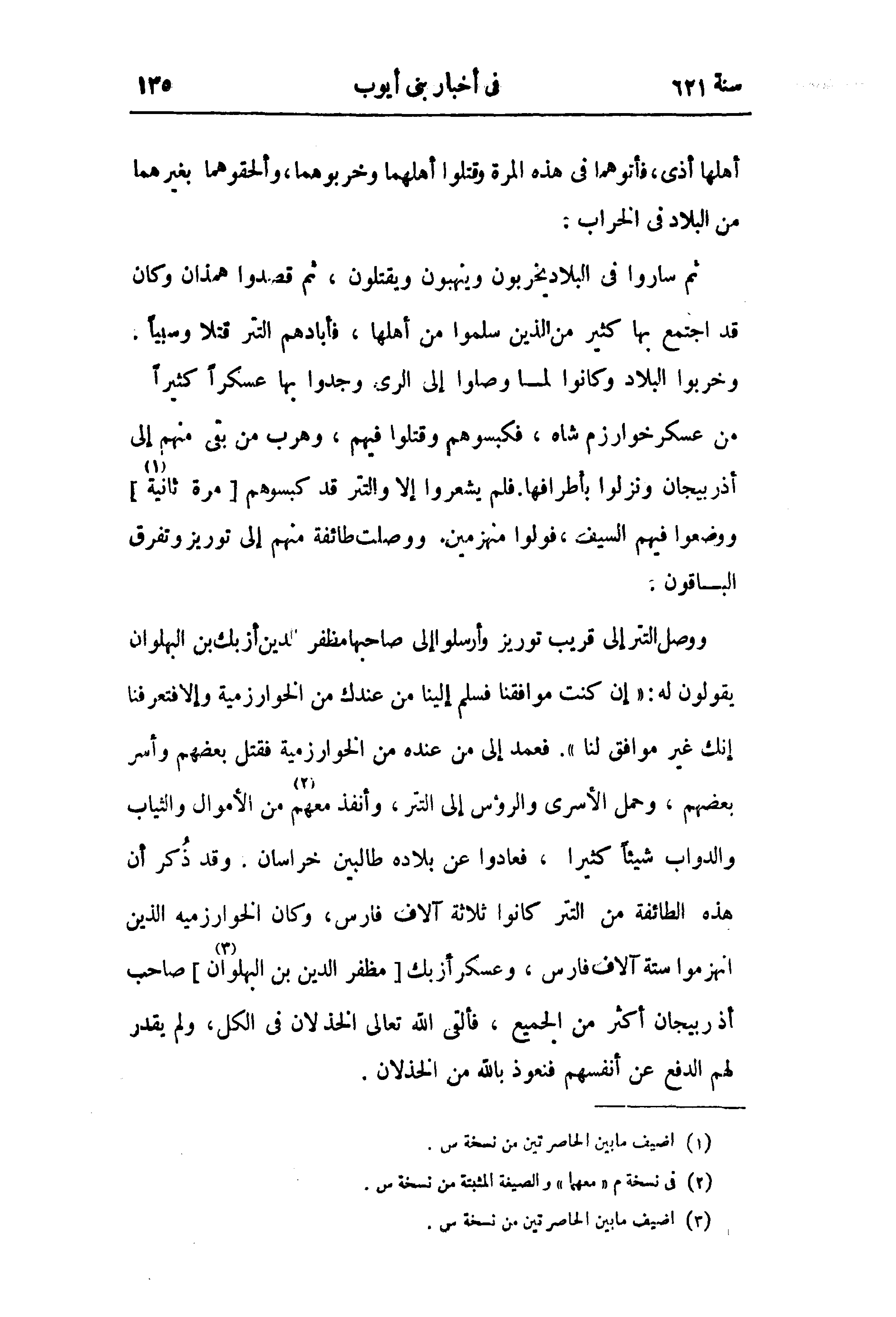 ووصل التتر إلى قريب توريز وأرسلوا إلى صاحبها مظفر الدين أزبك بن البهلوان يقولون له: «إن كنت موافقنا فسلم إلينا من عندك من الخوارزمية وإلا فتعرفنا إنك غير موافق لنا». فعمد إلى من عنده من الخوارزمية فقتل بعضهم وأسر بعضهم، وحمل الأسرى والرؤس إلى التتر، وأنفذ معهم (¬2) من الأموال والثياب والدواب شيئا كثيرا، فعادوا عن بلاده طالبين خراسان. وقد ذكر أن هذه الطائفة من التتر كانوا ثلاثة آلاف فارس، وكان الخوارزميه الذين انهزموا ستة آلاف فارس، وعسكر أزبك [مظفر الدين بن البهلوان (¬3)] صاحب أذربيجان أكثر من الجميع، فألقى الله تعالى الخذلان في الكل، ولم يقدر لهم الدفع عن أنفسهم فنعوذ بالله من الخذلان.