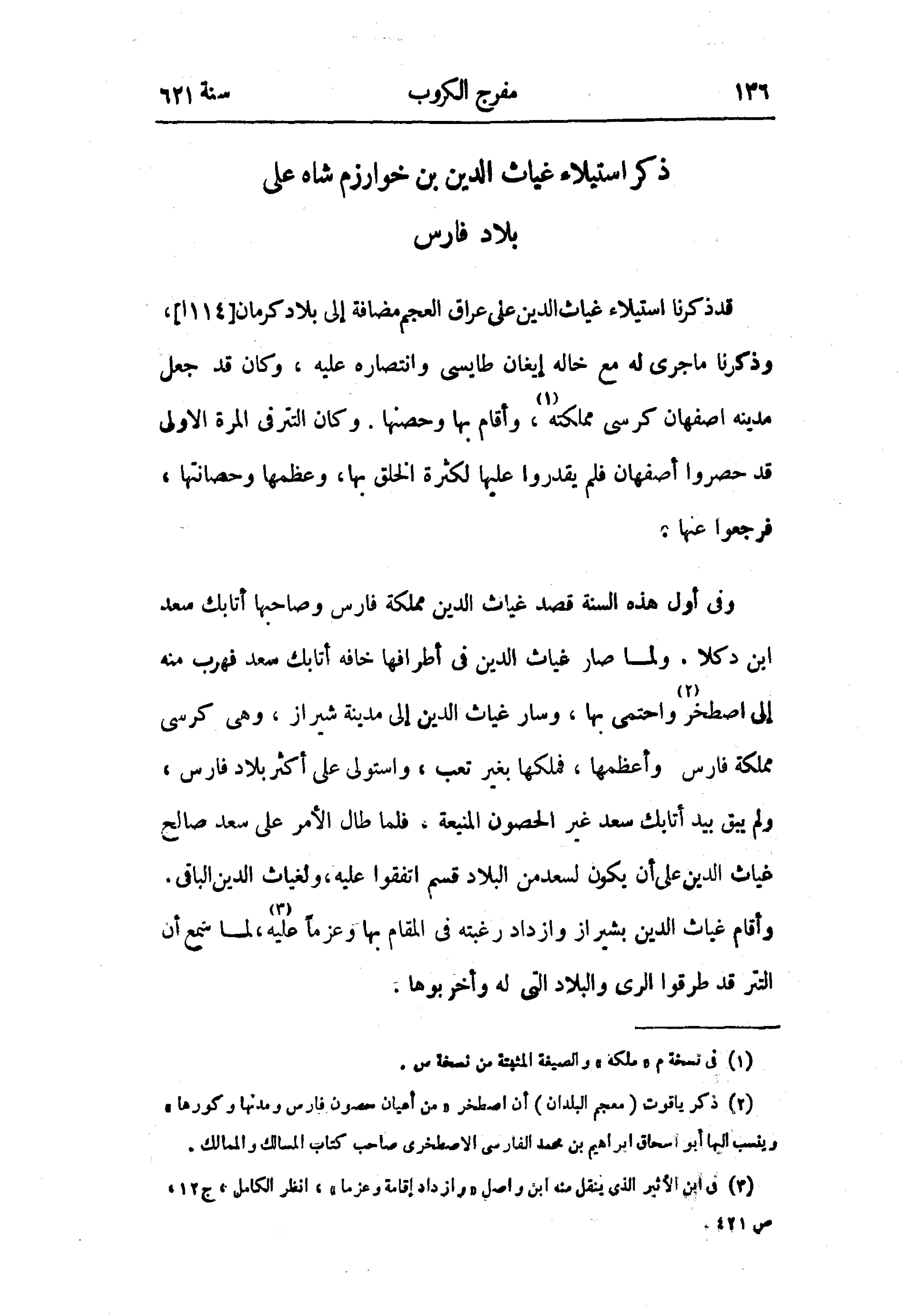 وفى أول هذه السنة قصد غياث الدين مملكة فارس وصاحبها أتابك سعد ابن دكلا. ولما صار غياث الدين في أطرافها خافه أتابك سعد فهرب منه إلى اصطخر (¬2) واحتمى بها، وسار غياث الدين إلى مدينة شيراز، وهى كرسى مملكة فارس وأعظمها، فملكها بغير تعب، واستولى على أكثر بلاد فارس، ولم يبق بيد أتابك سعد غير الحصون المنيعة، فلما طال الأمر على سعد صالح غياث الدين على أن يكون لسعد من البلاد قسم اتفقوا عليه، ولغياث الدين الباقى.