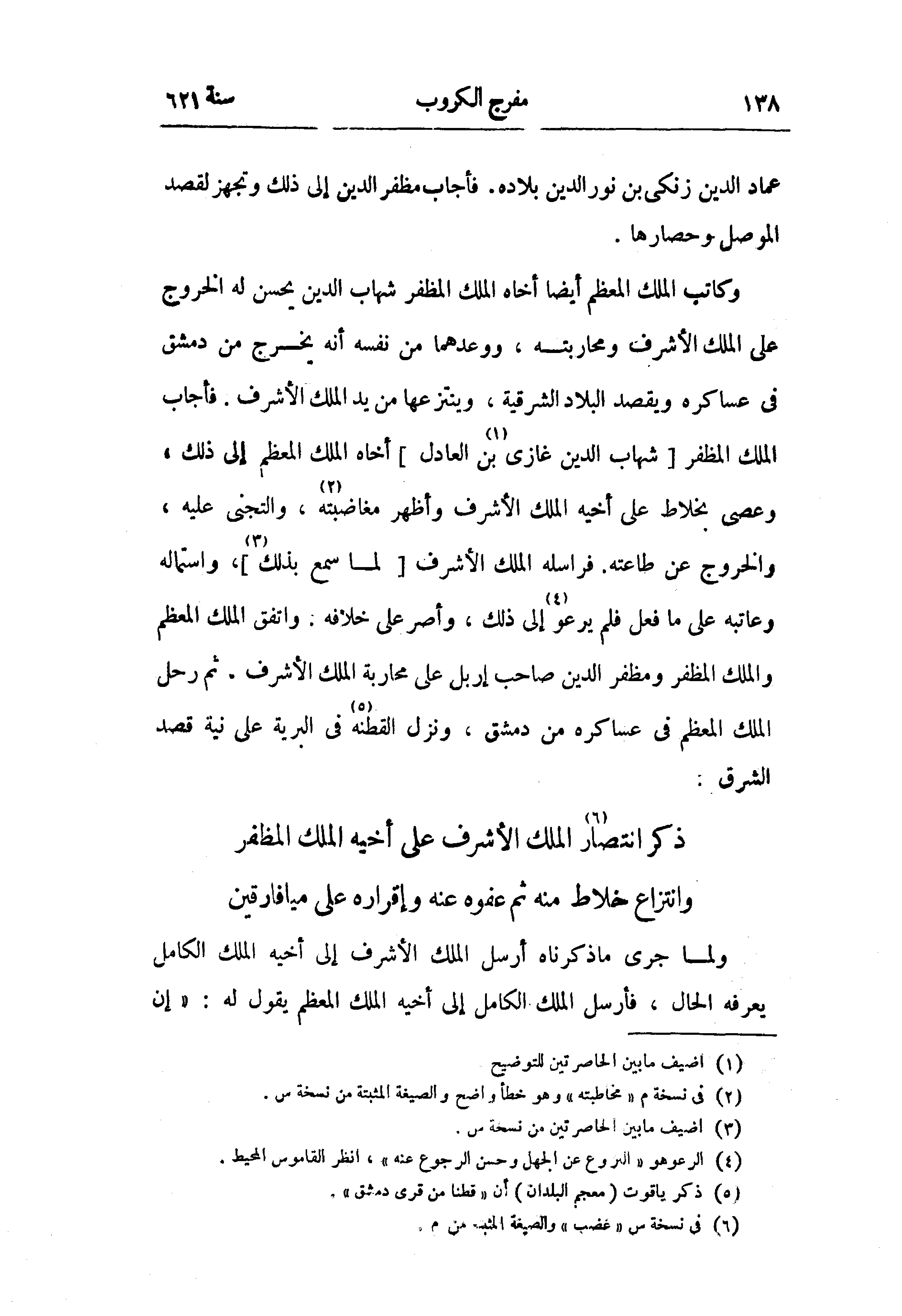 ولما جرى ما ذكرناه أرسل الملك الأشرف إلى أخيه الملك الكامل يعرفه الحال، فأرسل الملك الكامل إلى أخيه الملك المعظم يقول له: «إن