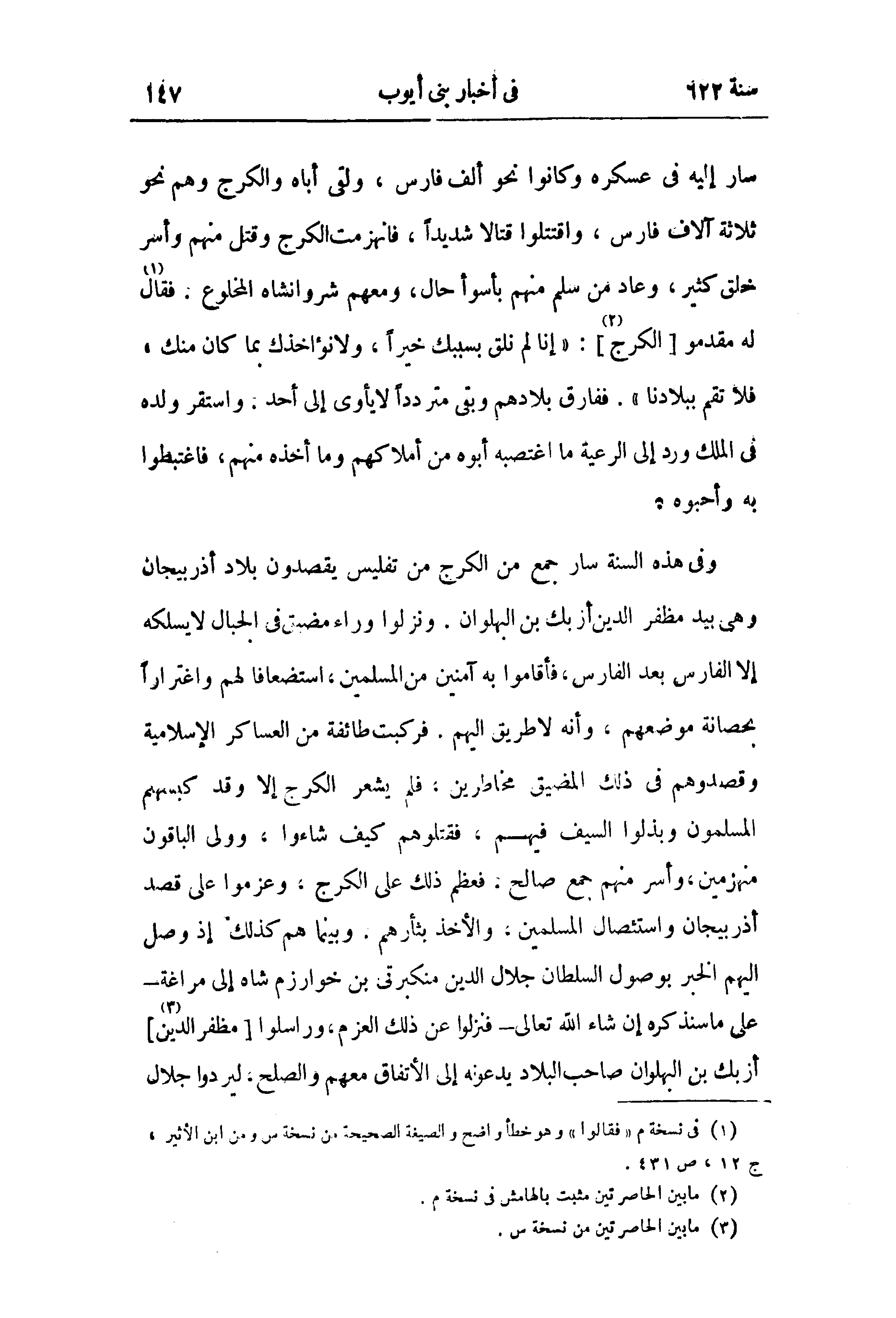 وفى هذه السنة سار جمع من الكرج من تفليس يقصدون بلاد أذربيجان وهى بيد مظفر الدين أزبك بن البهلوان. ونزلوا وراء مضيق في الجبال لا يسلكه إلا الفارس بعد الفارس، فأقاموا به آمنين من المسلمين، استضعافا لهم واغترارا بحصانة موضعهم، وأنه لا طريق اليهم. فركبت طائفة من العساكر الإسلامية وقصدوهم في ذلك المضيق مخاطرين، فلم يشعر الكرج إلا وقد كبسهم المسلمون وبذلوا السيف فيهم، فقتلوهم كيف شاءوا، وولى الباقون منهزمين، وأسر منهم جمع صالح. فعظم ذلك على الكرج، وعزموا على قصد أذربيجان واستئصال المسلمين، والأخذ بثأرهم. وبينما هم كذلك إذ وصل اليهم الخبر بوصول السلطان جلال الدين منكبرتى بن خوارزم شاه إلى مراغة - على ما سنذكره إن شاء الله تعالى - فنزلوا عن ذلك العزم، وراسلوا [مظفر الدين (¬3)] أزبك بن البهلوان صاحب البلاد يدعونه إلى الأتفاق معهم والصلح، ليردوا جلال