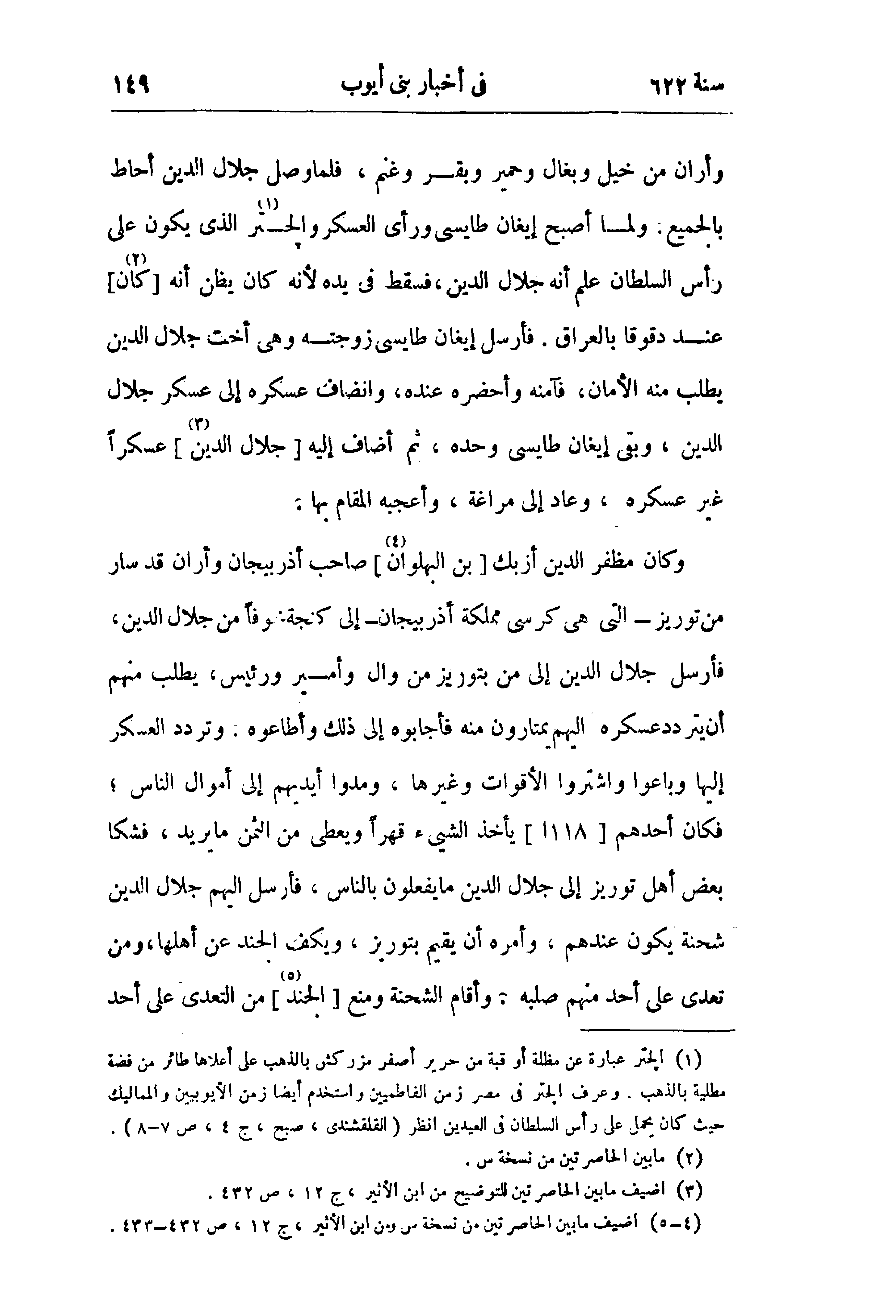 وأران من خيل وبغال وحمير وبقر وغنم، فلما وصل جلال الدين أحاط بالجميع. ولما أصبح إيغان طايسى ورأى العسكر والجتر (¬1) الذى يكون على رأس السلطان علم أنه جلال الدين، فسقط في يده لأنه كان يظن أنه [كان (¬2)] عند دقوقا بالعراق. فأرسل إيغان طايسى زوجته وهى أخت جلال الدين يطلب منه الأمان، فآمنه وأحضره عنده، وانضاف عسكره إلى عسكر جلال الدين، وبقى إيغان طايسى وحده، ثم أضاف إليه [جلال الدين (¬3)] عسكرا غير عسكره، وعاد إلى مراغة، وأعجبه المقام بها.