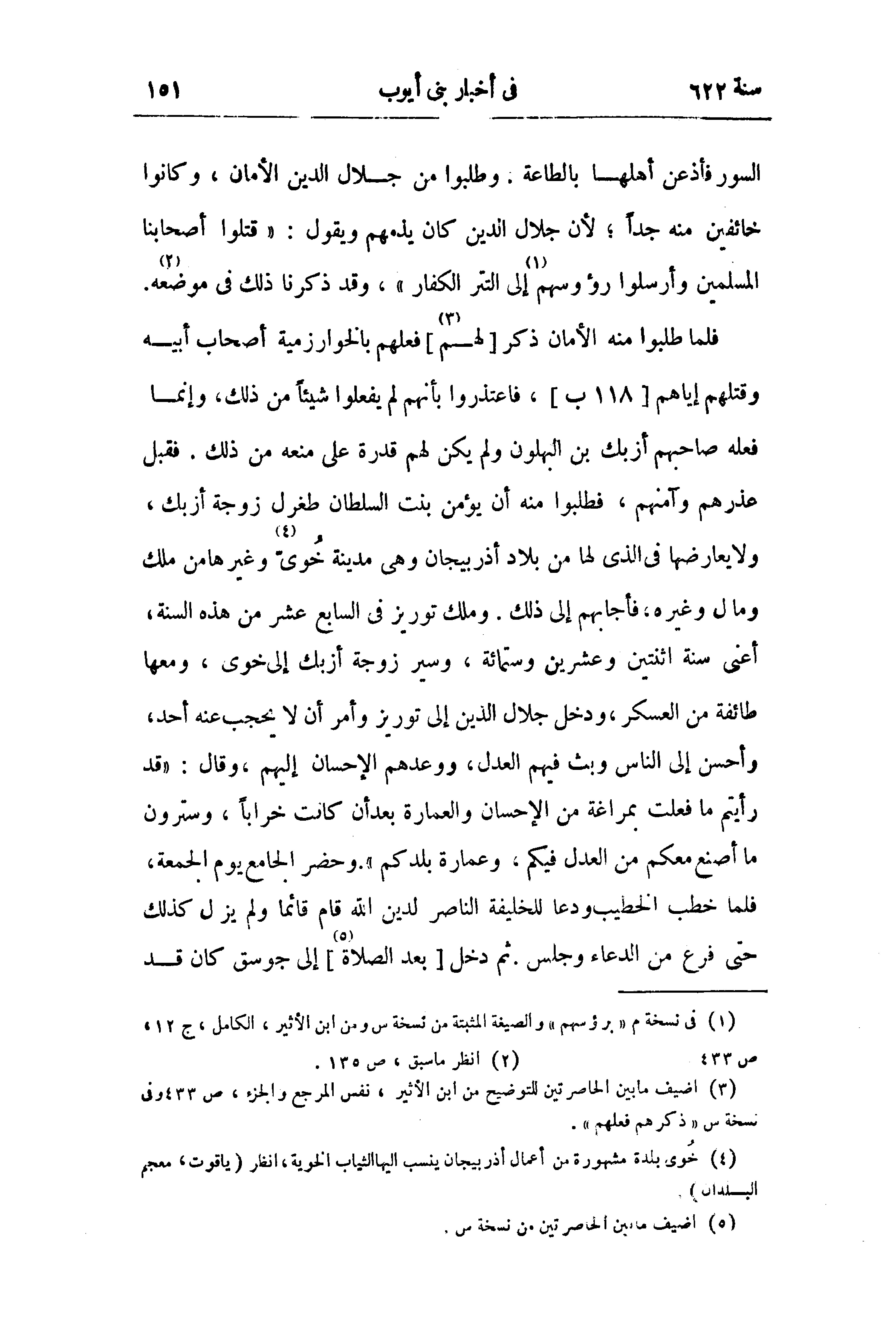 فلما طلبوا منه الأمان ذكر [لهم (¬3)] فعلهم بالخوارزمية أصحاب أبيه وقتلهم إياهم [118 ب]، فاعتذروا بأنهم لم يفعلوا شيئا من ذلك، وإنما فعله صاحبهم أزبك بن البهلون ولم يكن لهم قدرة على منعه من ذلك. فقبل عذرهم وآمنهم، فطلبوا منه أن يؤمن بنت السلطان طغرل زوجة أزبك، ولا يعارضها في الذى لها من بلاد أذربيجان وهى مدينة خوىّ (¬4) وغيرها من ملك ومال وغيره، فأجابهم إلى ذلك. وملك توريز في السابع عشر من هذه السنة، أعنى سنة اثنتين وعشرين وستمائة، وسير زوجة أزبك إلى خوى، ومعها طائفة من العسكر، ودخل جلال الدين إلى توريز وأمر أن لا يحجب عنه أحد، وأحسن إلى الناس وبث فيهم العدل، ووعدهم الإحسان إليهم، وقال: «قد رأيتم ما فعلت بمراغة من الإحسان والعمارة بعد أن كانت خرابا، وسترون ما أصنع معكم من العدل فيكم، وعمارة بلدكم». وحضر الجامع يوم الجمعة، فلما خطب الخطيب ودعا للخليفة الناصر لدين الله قام قائما ولم يزل كذلك حتى فرغ من الدعاء وجلس. ثم دخل [بعد الصلاة (¬5)] إلى جوسق كان قد