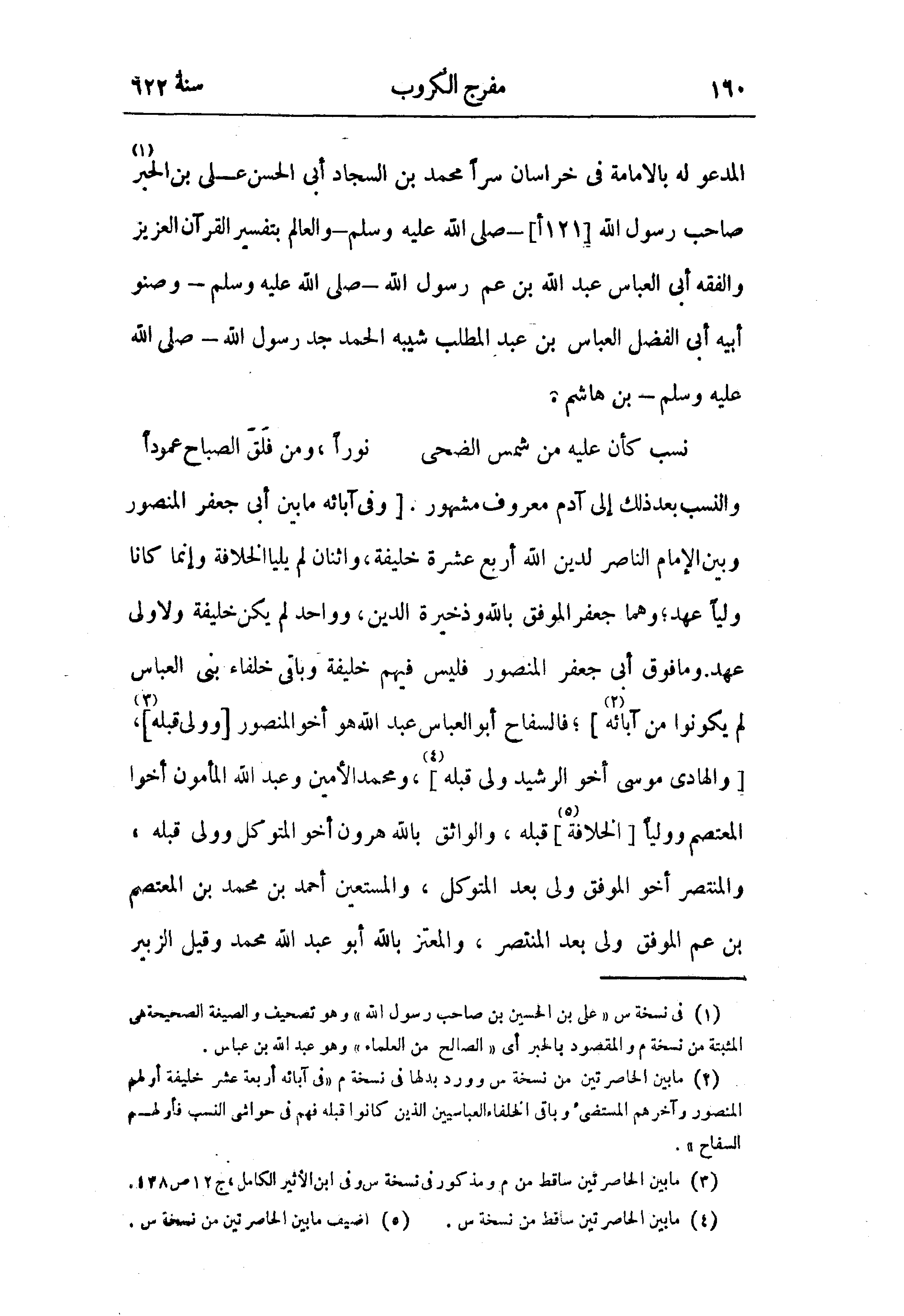 المدعو له بالامامة في خراسان سرا محمد بن السجاد أبى الحسن على بن الحبر (¬1) صاحب رسول الله [121 أ]- صلّى الله عليه وسلم - والعالم بتفسير القرآن العزيز والفقه أبى العباس عبد الله بن عم رسول الله - صلّى الله عليه وسلم - وصنو أبيه أبى الفضل العباس بن عبد المطلب شيبه الحمد جد رسول الله - صلّى الله عليه وسلم - بن هاشم.