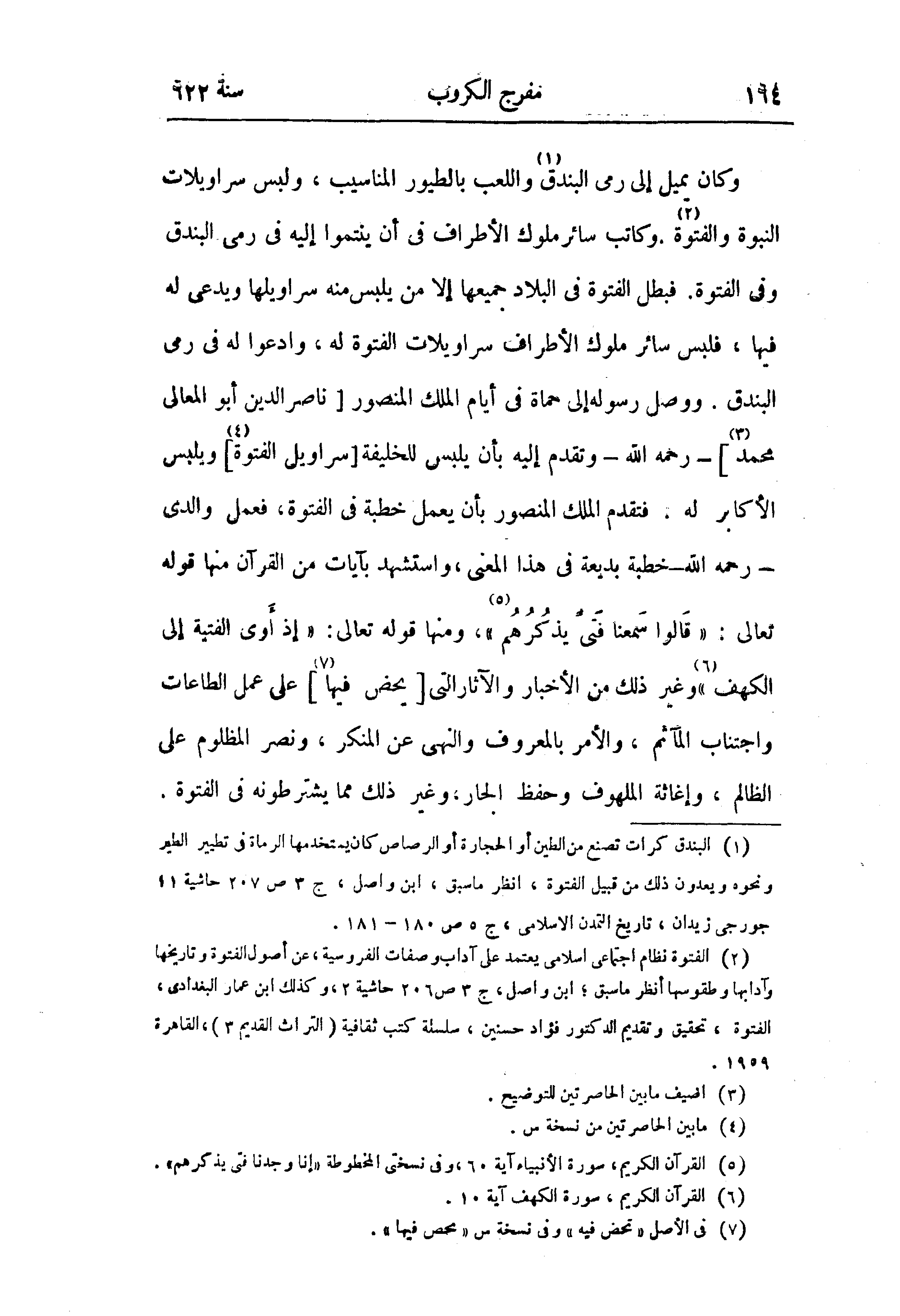 (¬2) الفتوة نظام اجتماعى اسلامى يعتمد على آداب وصفات الفروسية، عن أصول الفتوة وتاريخها وآدابها وطقوسها أنظر ما سبق؛ ابن واصل، ج 3 ص 206 حاشية 2، وكذلك ابن عمار البغدادى، الفتوة، تحقيق وتقديم الدكتور فؤاد حسنين، سلسلة كتب ثقافية (التراث القديم 3)، القاهرة 1959.