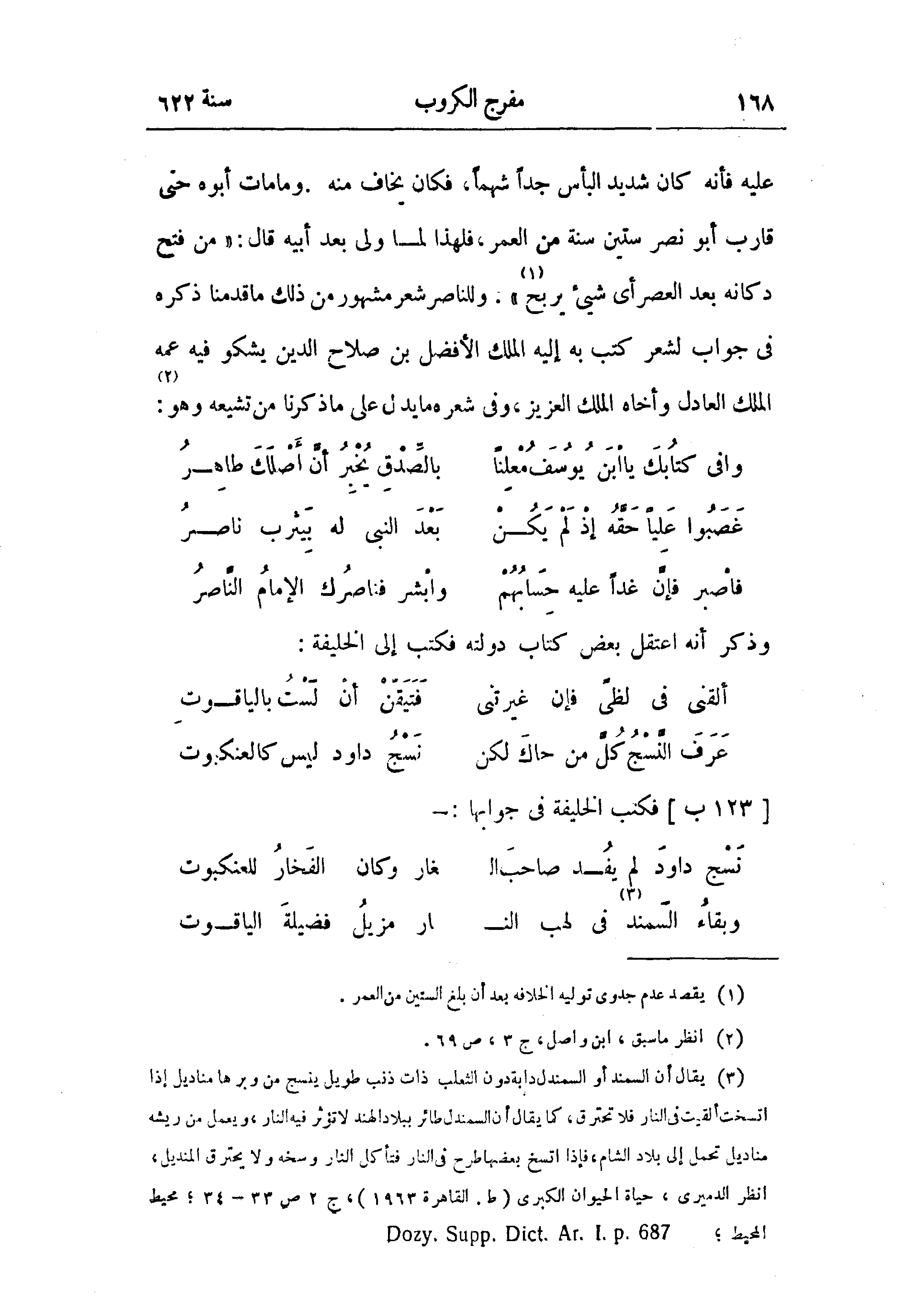 عليه فأنه كان شديد البأس جدا شهما، فكان يخاف منه. ومامات أبوه حتى قارب أبو نصر ستين سنة من العمر، فلهذا لما ولى بعد أبيه قال: «من فتح دكانه بعد العصرأى شيئ يربح (¬1)». وللناصر شعر مشهور من ذلك ما قدمنا ذكره في جواب لشعر كتب به إليه الملك الأفضل بن صلاح الدين يشكو فيه عمه الملك العادل وأخاه الملك العزيز، وفى شعره ما يدل على ما ذكرنا من تشيعه وهو (¬2):