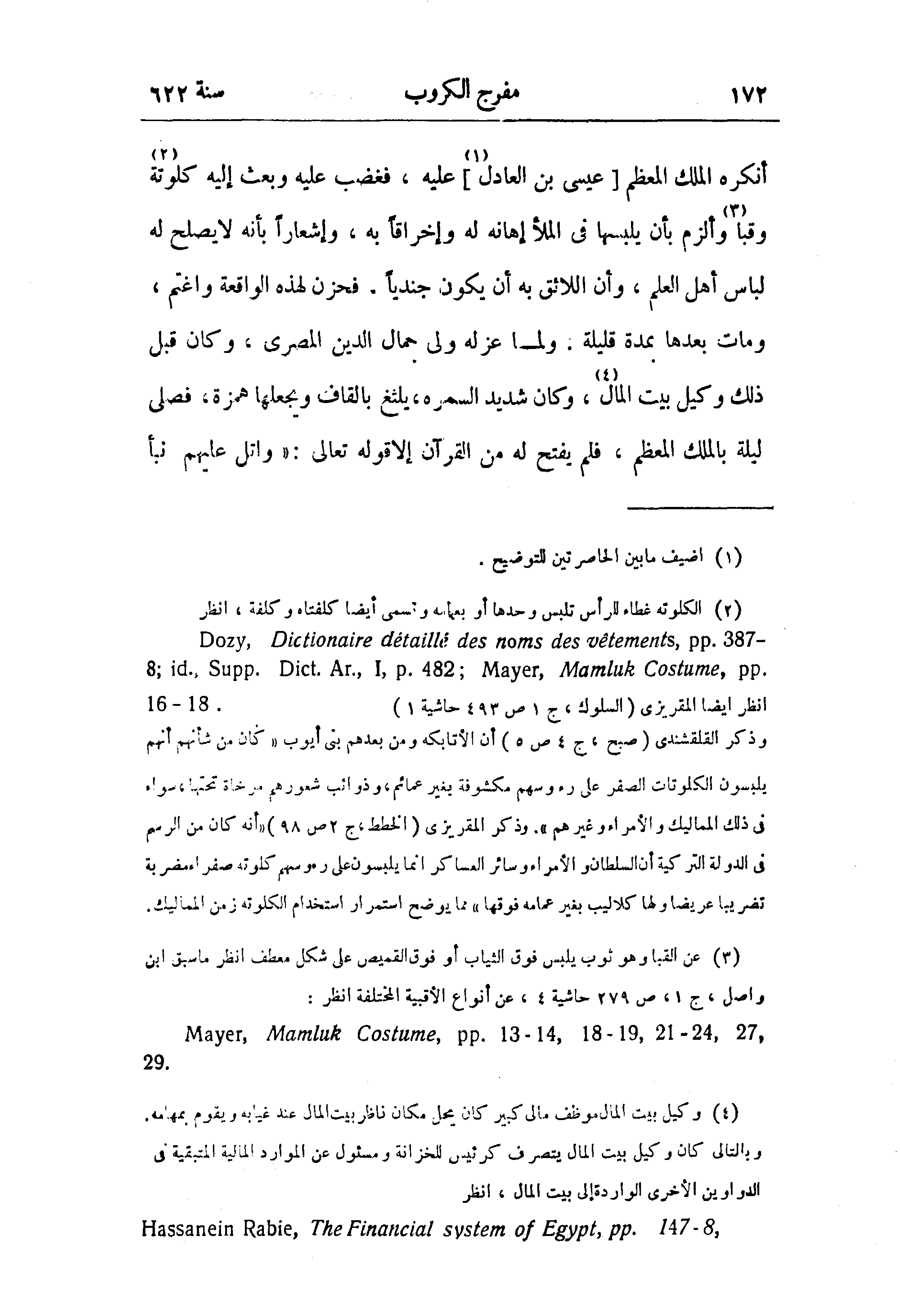 انظر ايضا المقريزى (السلوك، ج 1 ص 493 حاشية 1). 81 - 61 وذكر القلقشندى (صبح، ج 4 ص 5) أن الأتابكه ومن بعدهم بنى أيوب «كان من شأنهم أنهم يلبسون الكلوتات الصفر على رءوسهم مكشوفة بغير عمائم، وذوائب شعورهم مرخاة تحتها، سواء في ذلك المماليك والأمراء وغيرهم». وذكر المقريزى (الخطط، ج 2 ص 98) «أنه كان من الرسم في الدولة التركية أن السلطان والأمراء وسائر العساكر انما يلبسون على رءوسهم كلوته صفراء مضربة تضريبا عريضا ولها كلاليب بغير عمامه فوقها» مما يوضح استمرار استخدام الكلوته زمن المماليك.