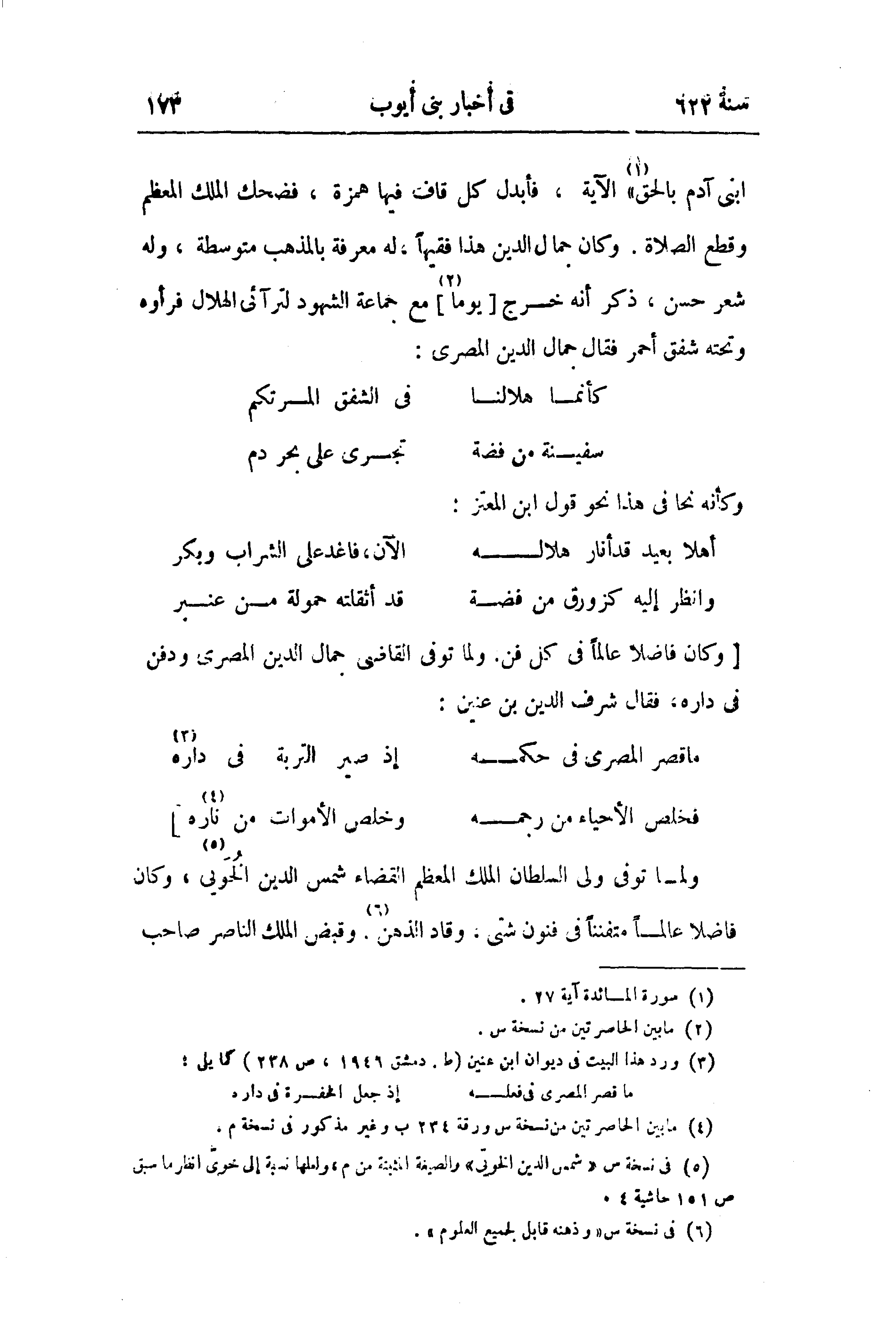 اِبْنَيْ آدَمَ بِالْحَقِّ (¬1)}» الآية، فأبدل كل قاف فيها همزة، فضحك الملك المعظم وقطع الصلاة. وكان جمال الدين هذا فقيها، له معرفة بالمذهب متوسطة، وله شعر حسن، ذكر أنه خرج [يوما (¬2)] مع جماعة الشهود لترآئى الهلال فرأوه وتحته شفق أحمر فقال جمال الدين المصرى: