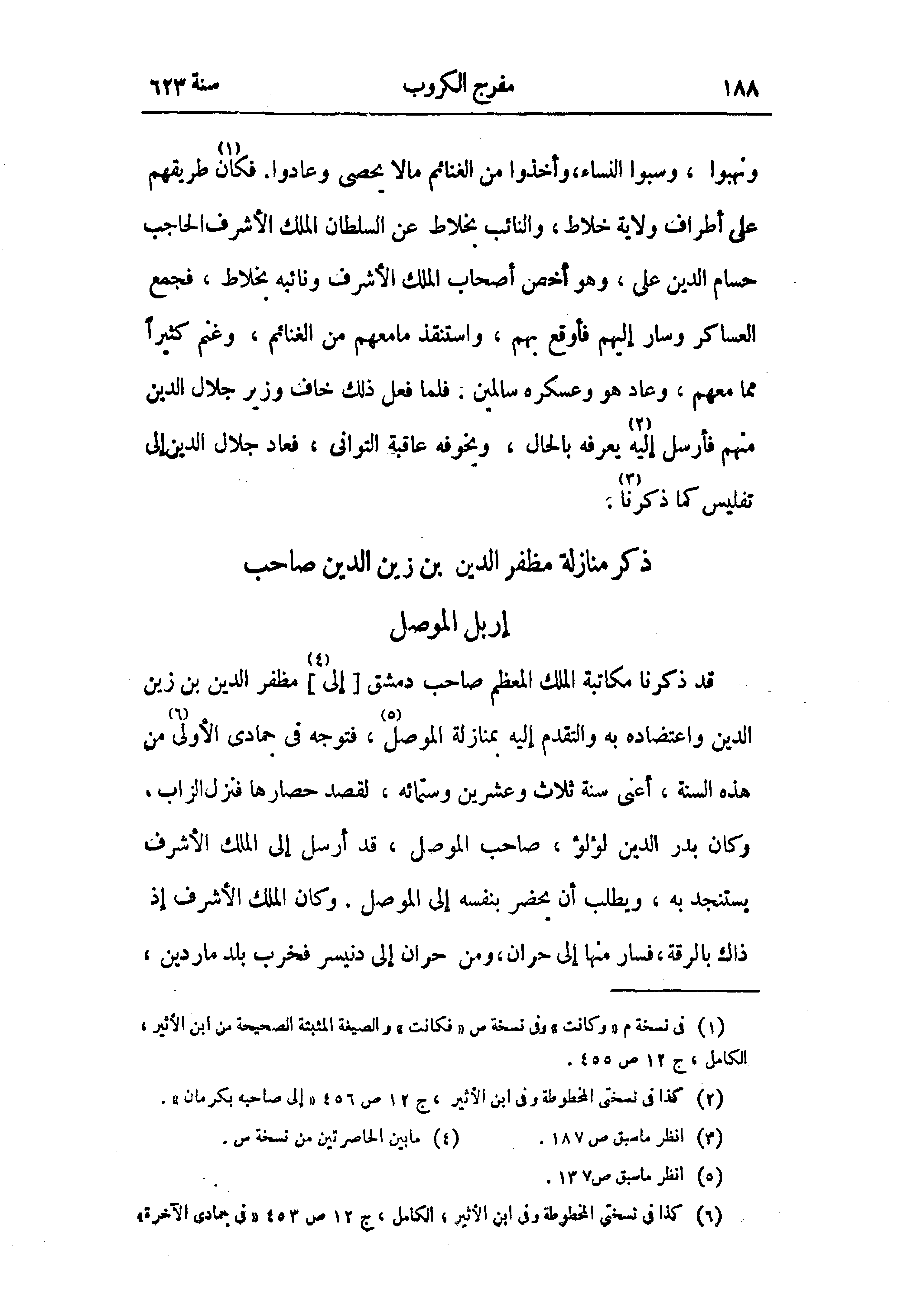 قد ذكرنا مكاتبة الملك المعظم صاحب دمشق [إلى (¬4)] مظفر الدين بن زين الدين واعتضاده به والتقدم إليه بمنازلة الموصل (¬5)، فتوجه في جمادى الأولى (¬6) من هذه السنة، أعنى سنة ثلاث وعشرين وستمائه، لقصد حصارها فنزل الزاب، وكان بدر الدين لؤلؤ، صاحب الموصل، قد أرسل إلى الملك الأشرف يستنجد به، ويطلب أن يحضر بنفسه إلى الموصل. وكان الملك الأشرف إذ ذاك بالرقة، فسار منها إلى حران، ومن حران إلى دنيسر فخرب بلد ماردين،