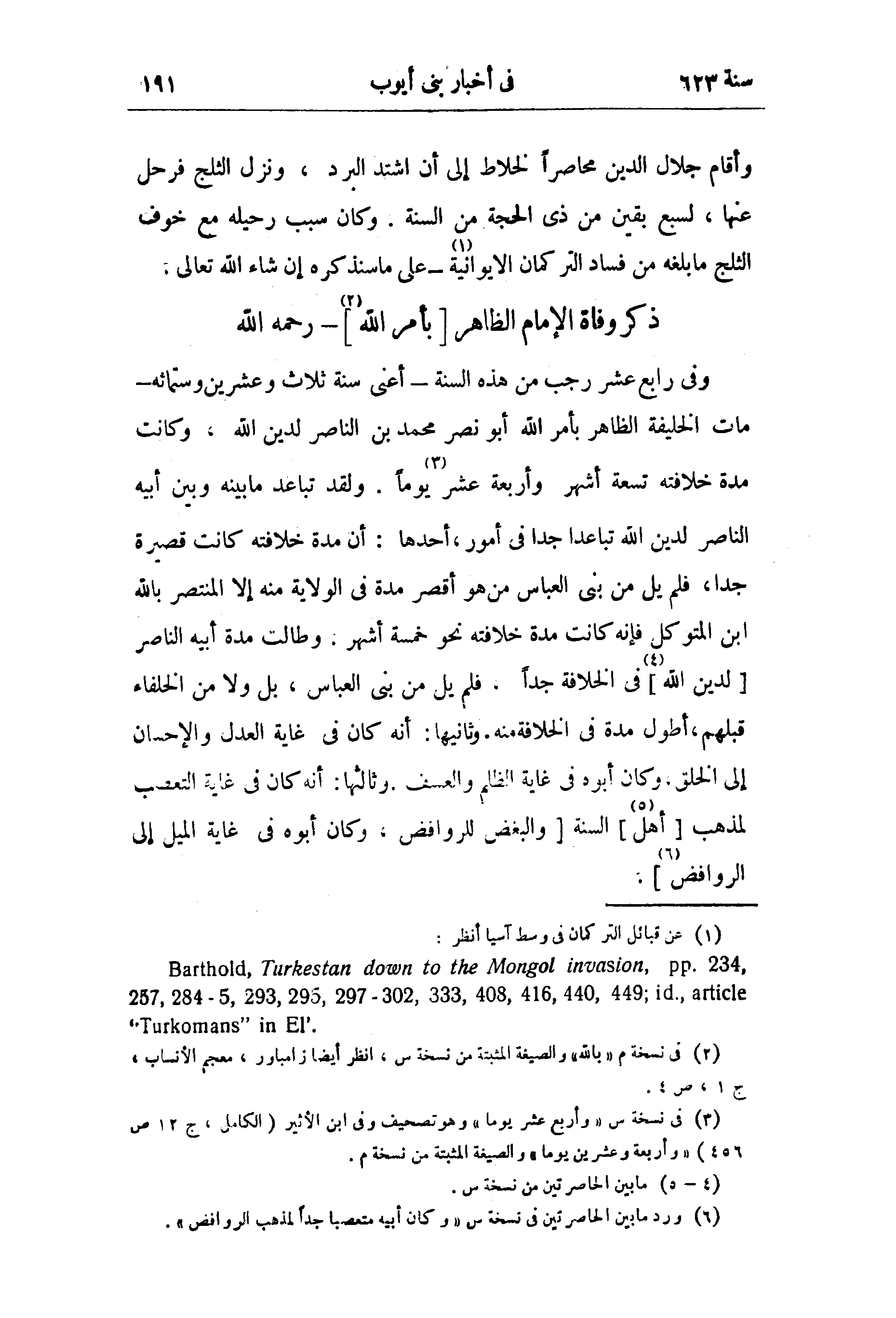 وفى رابع عشر رجب من هذه السنة - أعنى سنة ثلاث وعشرين وستمائه - مات الخليفة الظاهر بأمر الله أبو نصر محمد بن الناصر لدين الله، وكانت مدة خلافته تسعة أشهر وأربعة عشر (¬3) يوما. ولقد تباعد ما بينه وبين أبيه الناصر لدين الله تباعدا جدا في أمور، أحدها: أن مدة خلافته كانت قصيرة جدا، فلم يل من بنى العباس من هو أقصر مدة في الولاية منه إلا المنتصر بالله ابن المتوكل فإنه كانت مدة خلافته نحو خمسة أشهر. وطالت مدة أبيه الناصر [لدين الله] (¬4) في الخلافة جدا، فلم يل من بنى العباس، بل ولا من الخلفاء قبلهم، أطول مدة في الخلافة منه. وثانيها: أنه كان في غاية العدل والإحسان إلى الخلق، وكان أبوه في غاية الظلم والعسف. وثالثها: أنه كان في غاية التعصب لمذهب [أهل (¬5)] السنة [والبغض للروافض، وكان أبوه في غاية الميل إلى الروافض (¬6)].