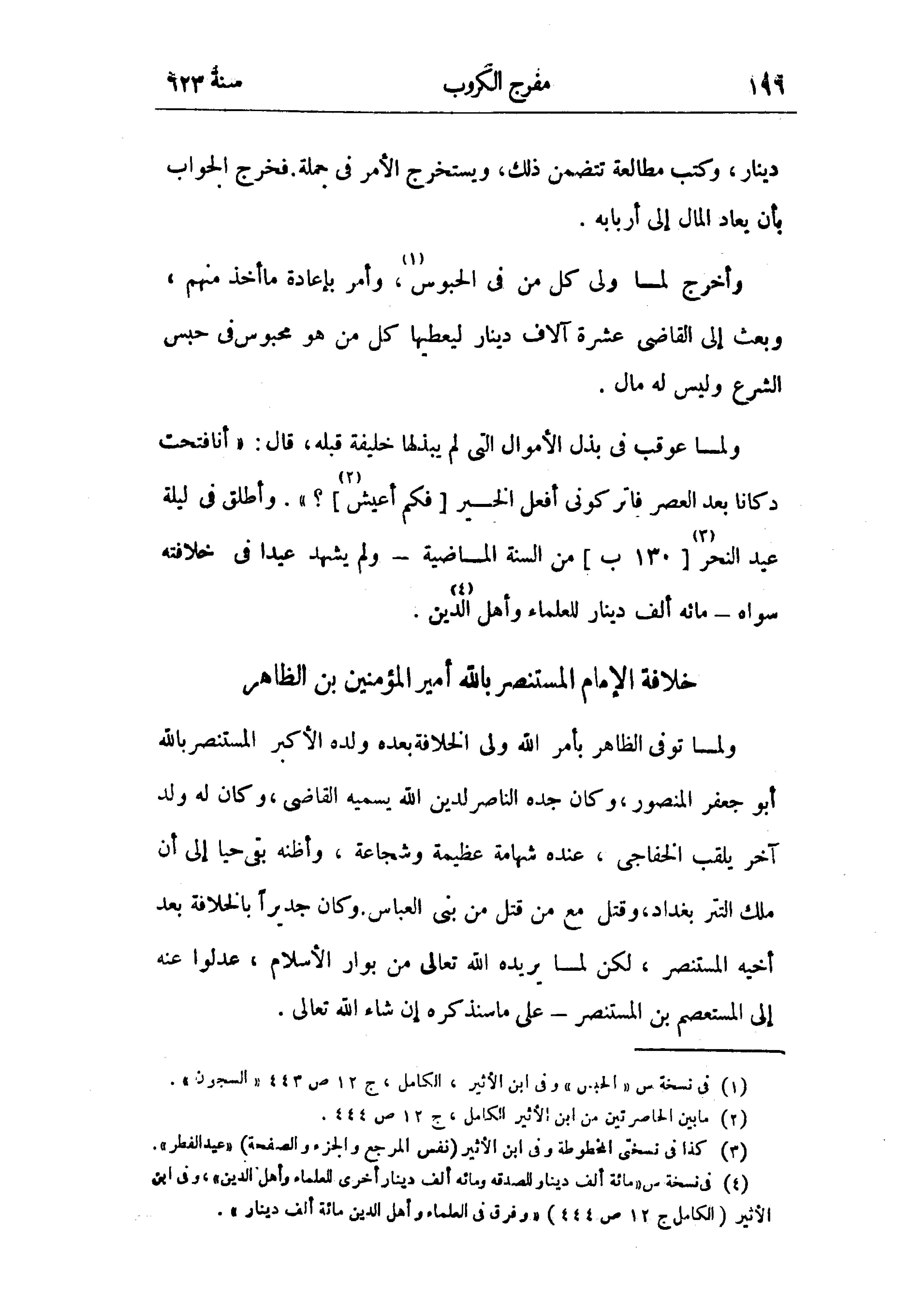 (¬4) في نسخة س «مائة ألف دينار للصدقه ومائه ألف دينار أخرى للعلماء وأهل الدين»، وفى ابن الأثير (الكامل ج 12 ص 444) «وفرق في العلماء وأهل الدين مائة ألف دينار».