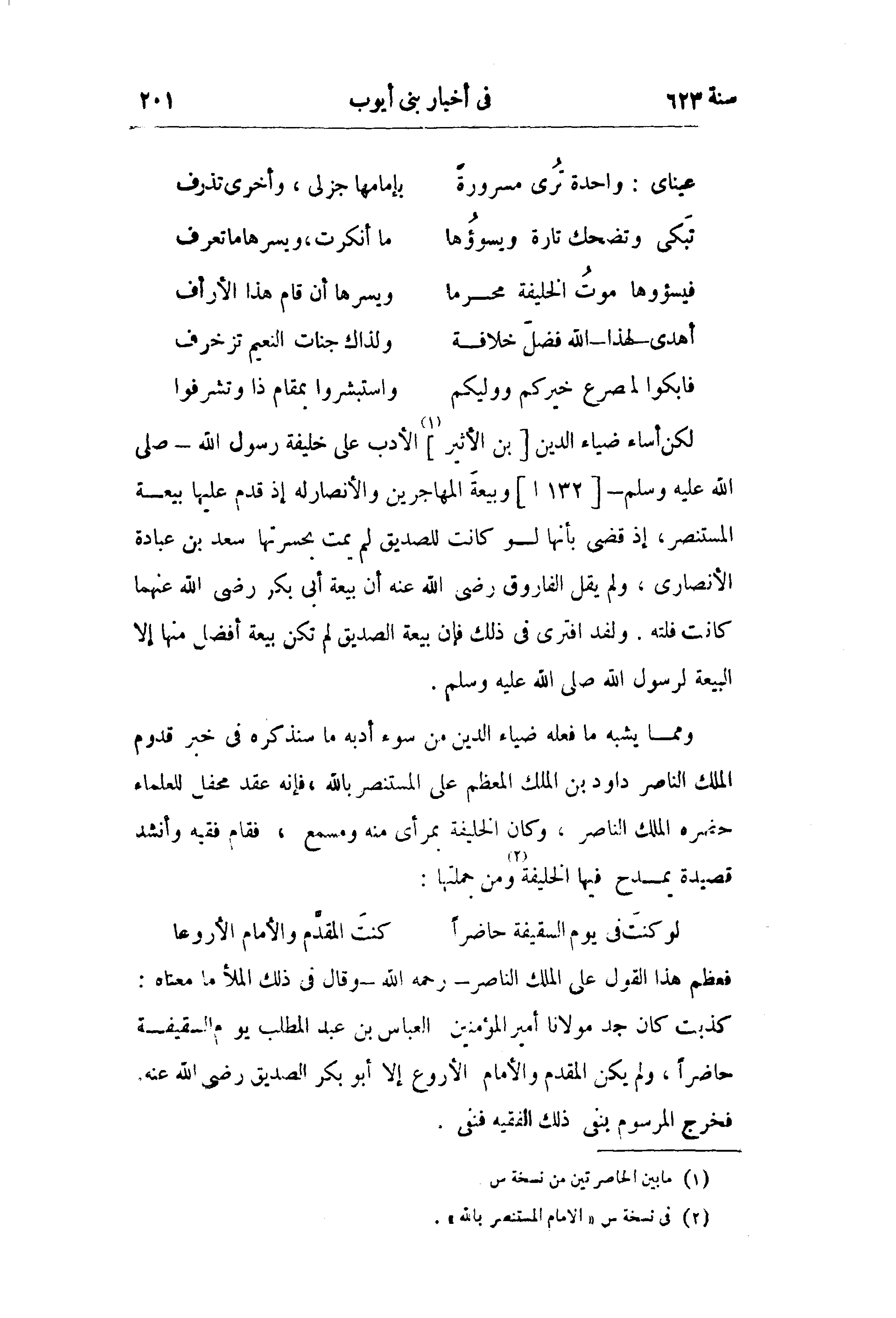 ومما يشبه ما فعله ضياء الدين من سوء أدبه ما سنذكره في خبر قدوم الملك الناصر داود بن الملك المعظم على المستنصر بالله، فإنه عقد محفل للعلماء حضره الملك الناصر، وكان الخليفة بمرأى منه ومسمع، فقام فقيه وأنشد قصيدة يمدح فيها الخليفة (¬2) ومن جملتها: