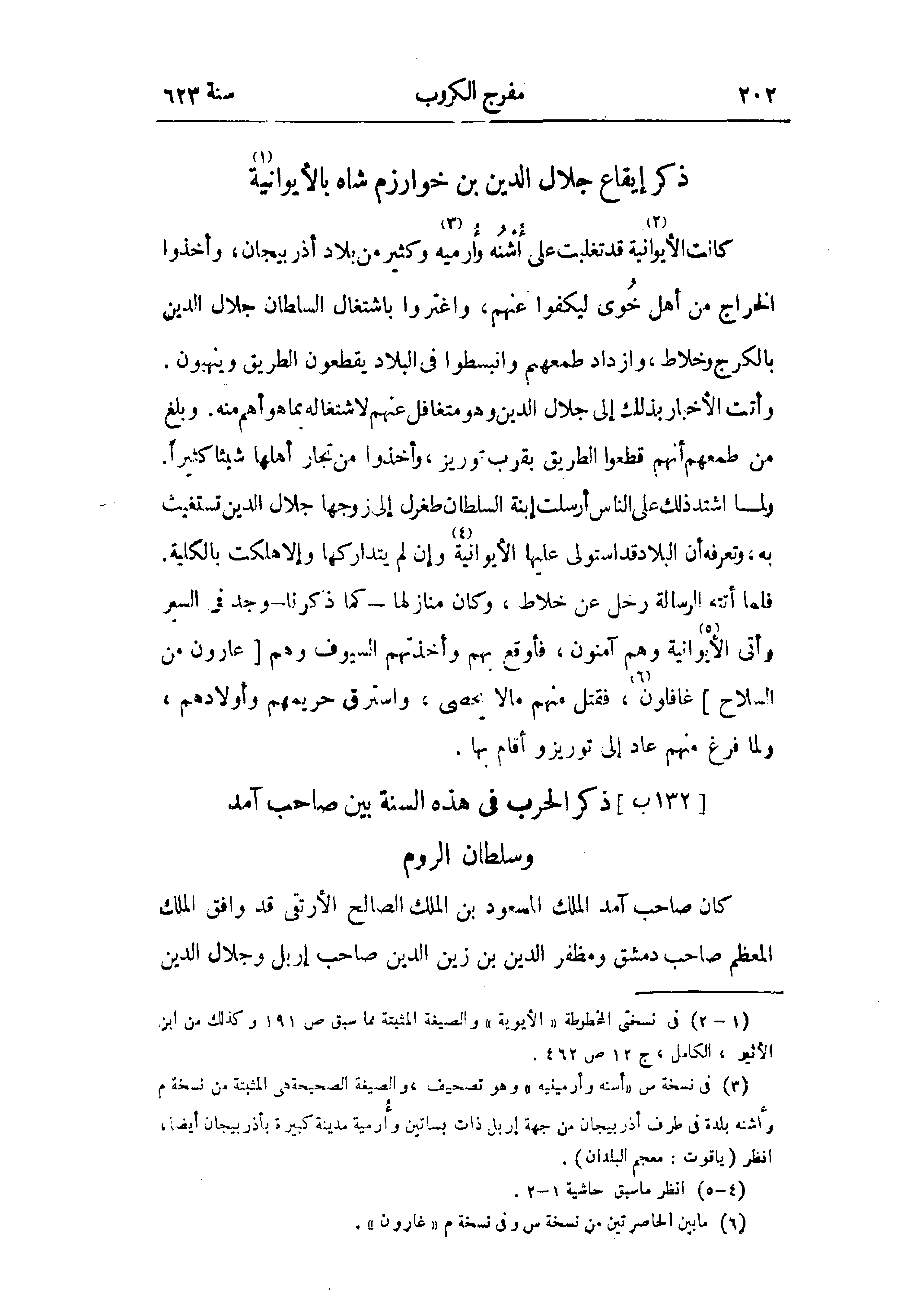 (¬2) في نسختى المخطوطة «الأيوية» والصيغة المثبتة مما سبق ص 191 وكذلك من ابن الأثير، الكامل، ج 12 ص 462.