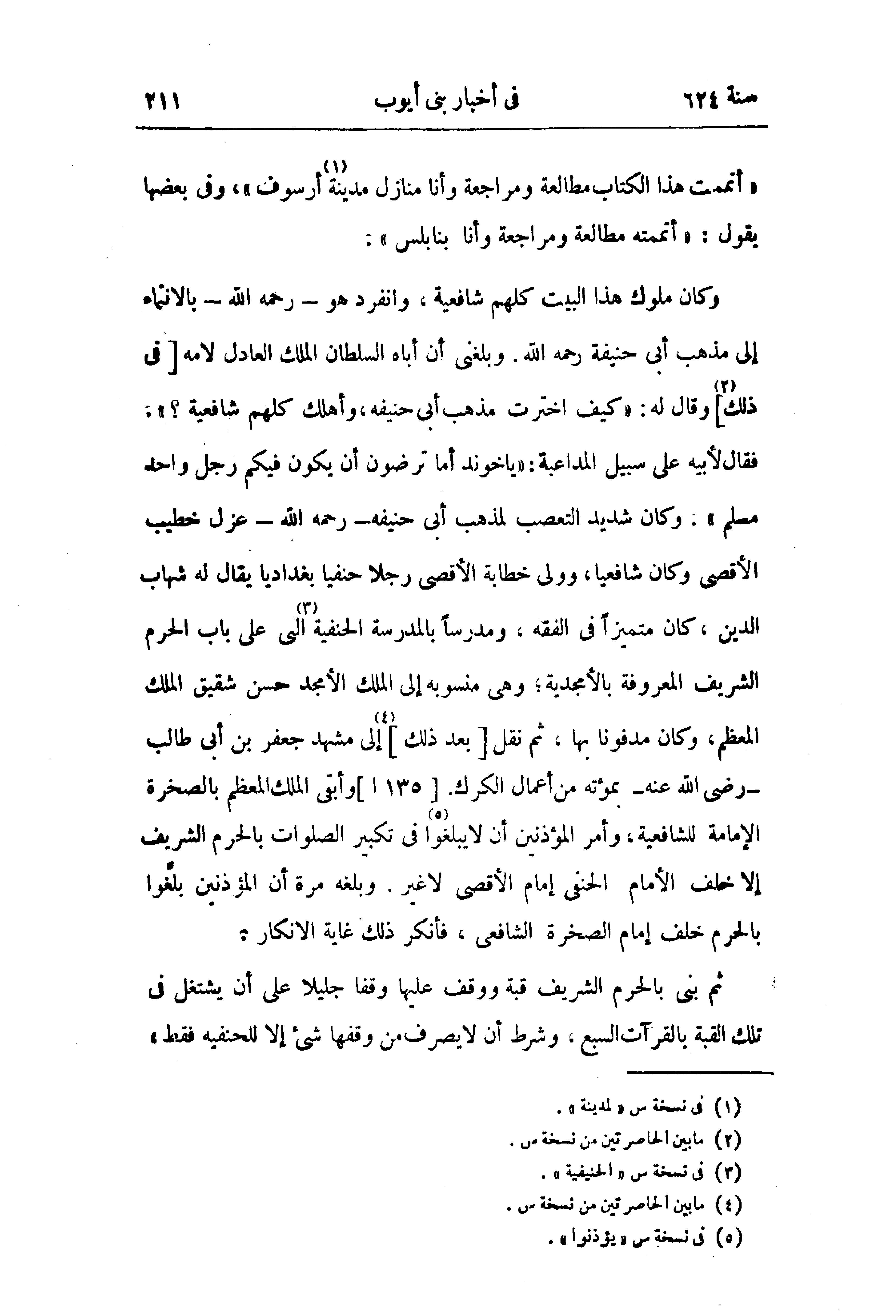 فقال لأبيه على سبيل المداعبة: «ياخوند أما ترضون أن يكون فيكم رجل واحد مسلم». وكان شديد التعصب لمذهب أبى حنيفه - رحمه الله - عزل خطيب الأقصى وكان شافعيا، وولى خطابة الأقصى رجلا حنفيا بغداديا يقال له شهاب الدين، كان متميزا في الفقه، ومدرسا بالمدرسة الحنفية (¬3) التي على باب الحرم الشريف المعروفة بالأمجدية؛ وهى منسوبه إلى الملك الأمجد حسن شقيق الملك المعظم، وكان مدفونا بها، ثم نقل [بعد ذلك] (¬4) إلى مشهد جعفر بن أبى طالب - رضى الله عنه - بمؤته من أعمال الكرك. [135 ا] وأبقى الملك المعظم بالصخرة الإمامة للشافعية، وأمر المؤذنين أن لا يبلغوا (¬5) في تكبير الصلوات بالحرم الشريف إلا خلف الأمام الحنفى إمام الأقصى لا غير. وبلغه مرة أن المؤذنين بلّغوا بالحرم خلف إمام الصخرة الشافعى، فأنكر ذلك غاية الانكار.
