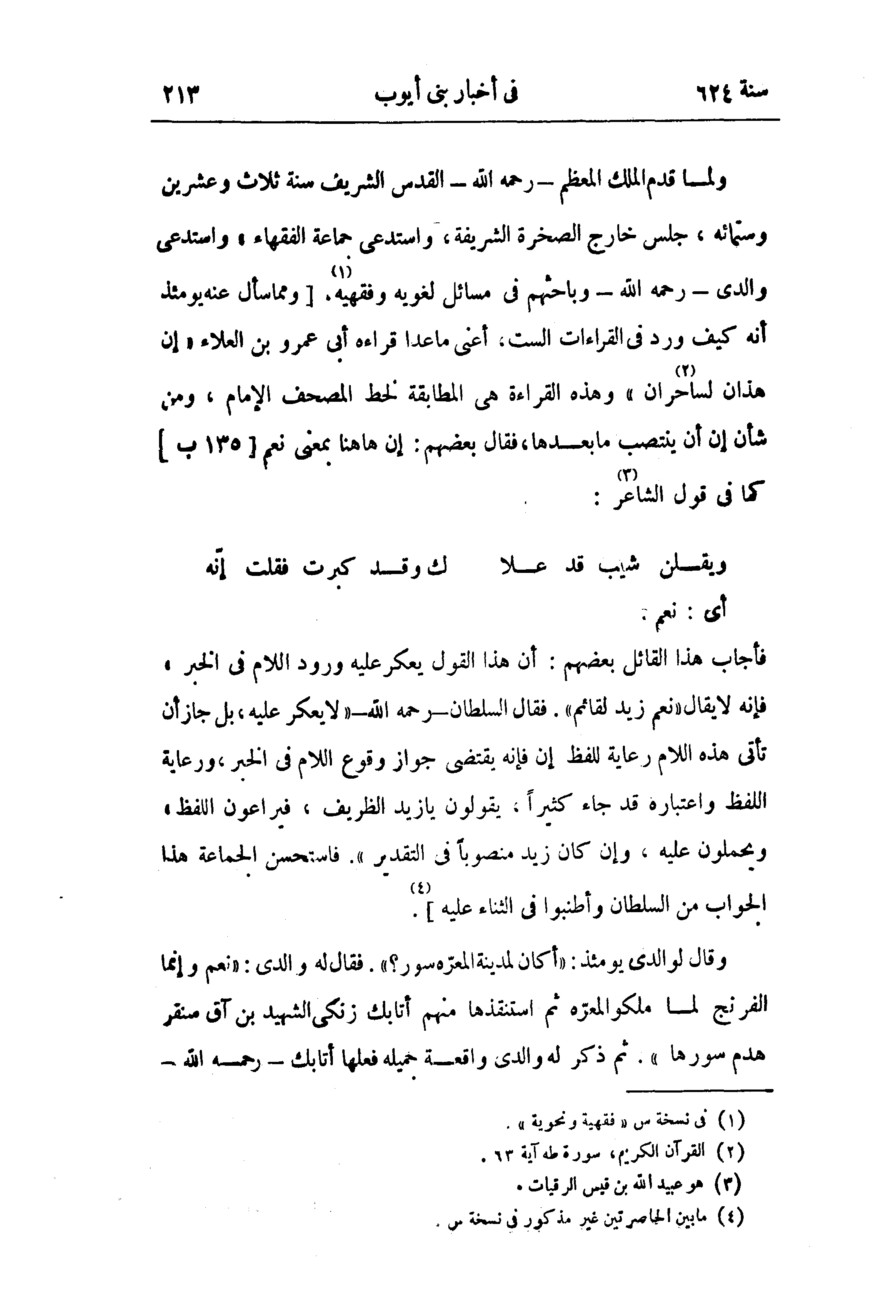 ولما قدم الملك المعظم - رحمه الله - القدس الشريف سنة ثلاث وعشرين وستمائة، جلس خارج الصخرة الشريفة، واستدعى جماعة الفقهاء، واستدعى والدى - رحمه الله - وباحثهم في مسائل لغويه وفقهيه (¬1). [ومما سأل عنه يومئذ أنه كيف ورد في القراءات الست، أعنى ما عدا قراءه أبى عمرو بن العلاء {إِنْ هذانِ لَساحِرانِ} (¬2)» وهذه القراءة هى المطابقة لخط المصحف الإمام، ومن شأن إن أن ينتصب ما بعدها، فقال بعضهم: إن ها هنا بمعنى نعم [135 ب] كما في قول الشاعر (¬3):
