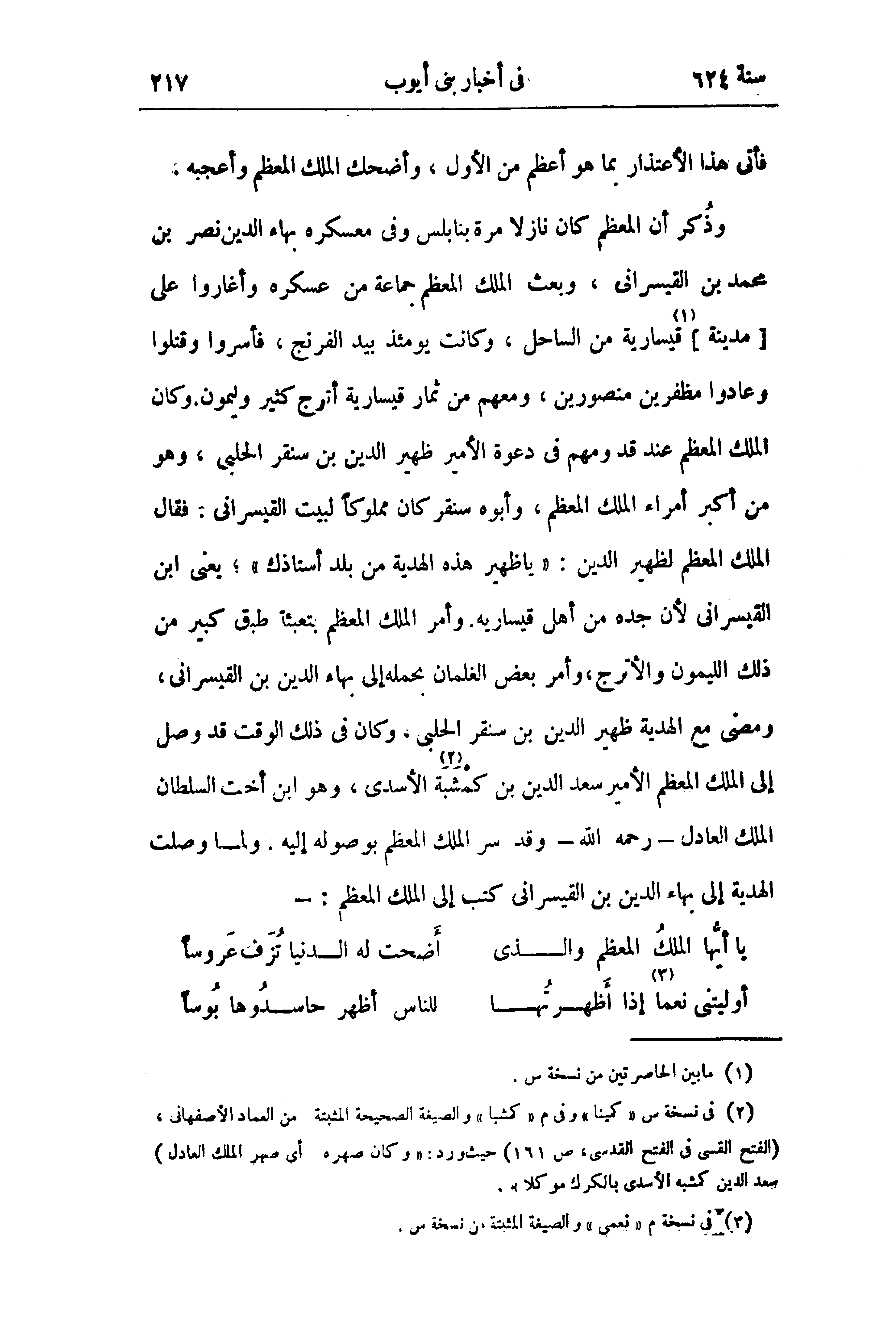 وذكر أن المعظم كان نازلا مرة بنابلس وفى معسكره بهاء الدين نصر بن محمد بن القيسرانى، وبعث الملك المعظم جماعة من عسكره وأغاروا على [مدينة] (¬1) قيسارية من الساحل، وكانت يومئذ بيد الفرنج، فأسروا وقتلوا وعادوا مظفرين منصورين، ومعهم من ثمار قيسارية أترج كثير وليمون. وكان الملك المعظم عند قد ومهم في دعوة الأمير ظهير الدين بن سنقر الحلبى، وهو من أكبر أمراء الملك المعظم، وأبوه سنقر كان مملوكا لبيت القيسرانى. فقال الملك المعظم لظهير الدين: «يا ظهير هذه الهدية من بلد أستاذك»؛ يعنى ابن القيسرانى لأن جده من أهل قيساريه. وأمر الملك المعظم بتعبئة طبق كبير من ذلك الليمون والأترج، وأمر بعض الغلمان بحمله إلى بهاء الدين بن القيسرانى، ومضى مع الهدية ظهير الدين بن سنقر الحلبى، وكان في ذلك الوقت قد وصل إلى الملك المعظم الأمير سعد الدين بن كمشبة (¬2) الأسدى، وهو ابن أخت السلطان الملك العادل - رحمه الله - وقد سر الملك المعظم بوصوله إليه. ولما وصلت الهدية إلى بهاء الدين بن القيسرانى كتب إلى الملك المعظم: -