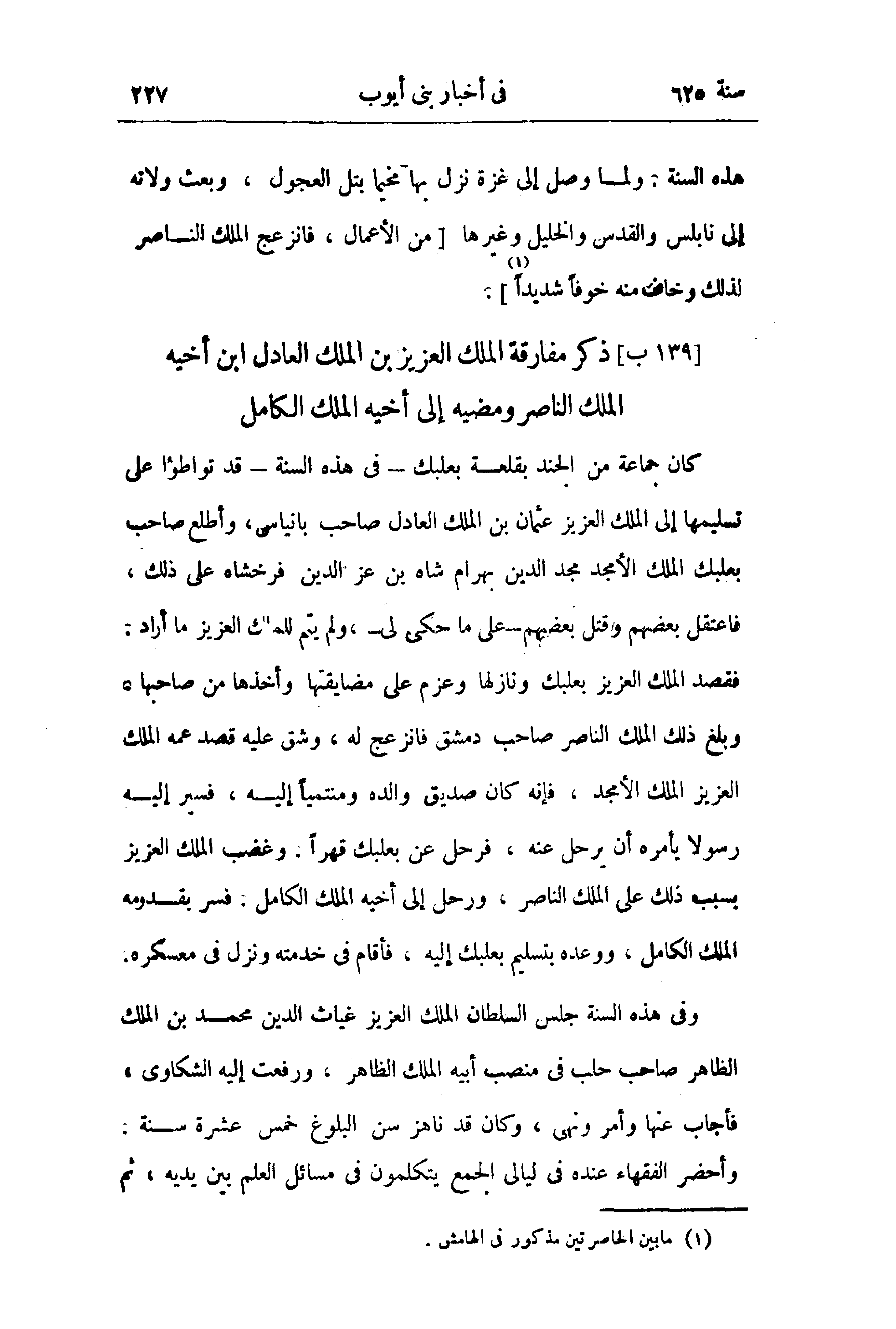 [139 ب] ذكر مفارقة الملك العزيز بن الملك العادل ابن أخيه الملك الناصر ومضيه إلى أخيه الملك الكامل