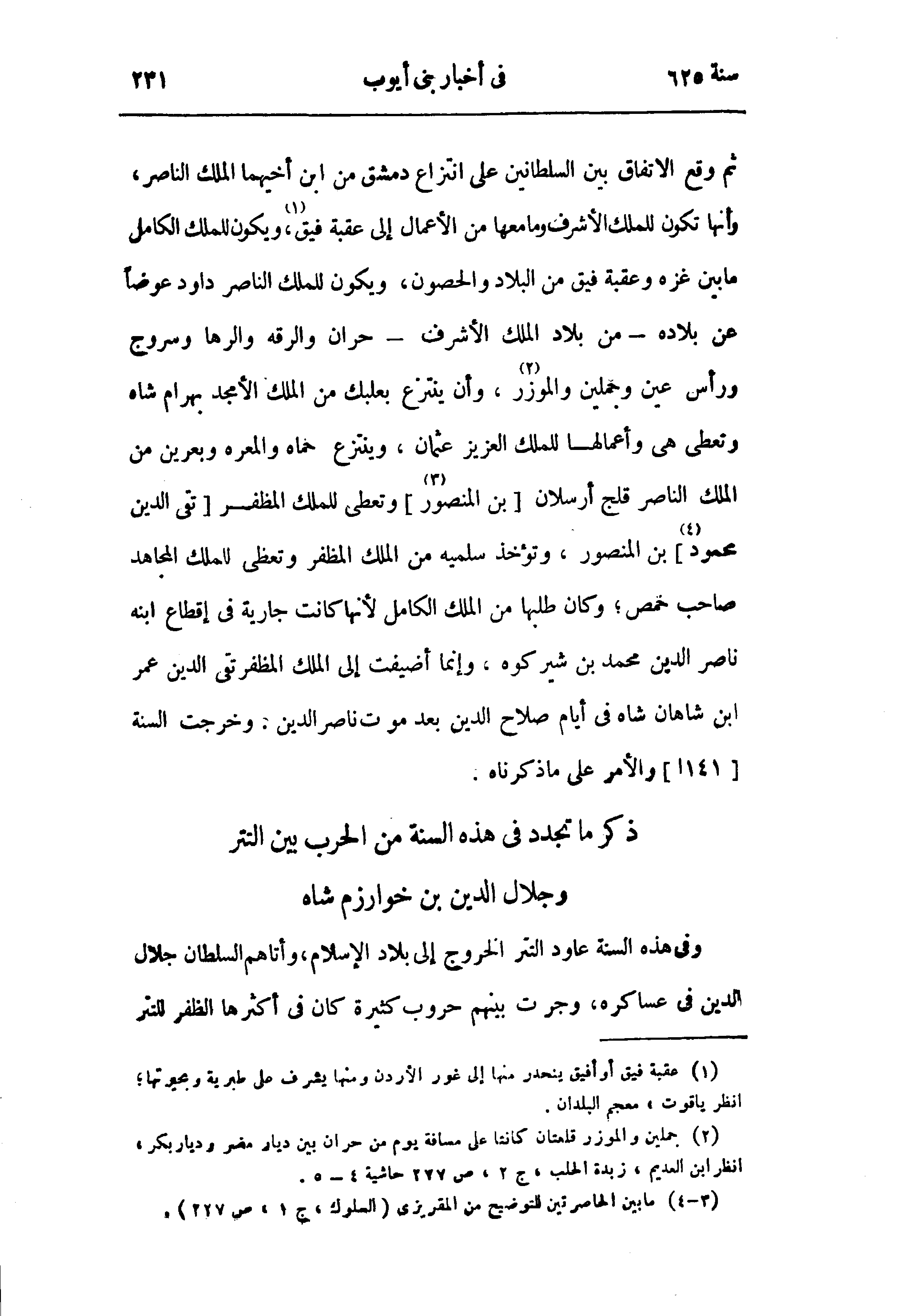 ثم وقع الاتفاق بين السلطانين على انتزاع دمشق من ابن أخيهما الملك الناصر، وأنها تكون للملك الأشرف وما معها من الأعمال إلى عقبة فيق (¬1)، ويكون للملك الكامل ما بين غزه وعقبة فيق من البلاد والحصون، ويكون للملك الناصر داود عوضا عن بلاده - من بلاد الملك الأشرف - حران والرقه والرها وسروج ورأس عين وجملين والموزر (¬2)، وأن ينتزع بعلبك من الملك الأمجد بهرام شاه وتعطى هى وأعمالها للملك العزيز عثمان، وينتزع حماه والمعره وبعرين من الملك الناصر قلج أرسلان [بن المنصور (¬3)] وتعطى للملك المظفر [تقى الدين محمود (¬4)] بن المنصور، وتؤخذ سلميه من الملك المظفر وتعطى للملك المجاهد صاحب حمص؛ وكان طلبها من الملك الكامل لأنها كانت جارية في إقطاع ابنه ناصر الدين محمد بن شيركوه، وإنما أضيفت إلى الملك المظفر تقى الدين عمر ابن شاهان شاه في أيام صلاح الدين بعد موت ناصر الدين. وخرجت السنة [141 ا] والأمر على ما ذكرناه.