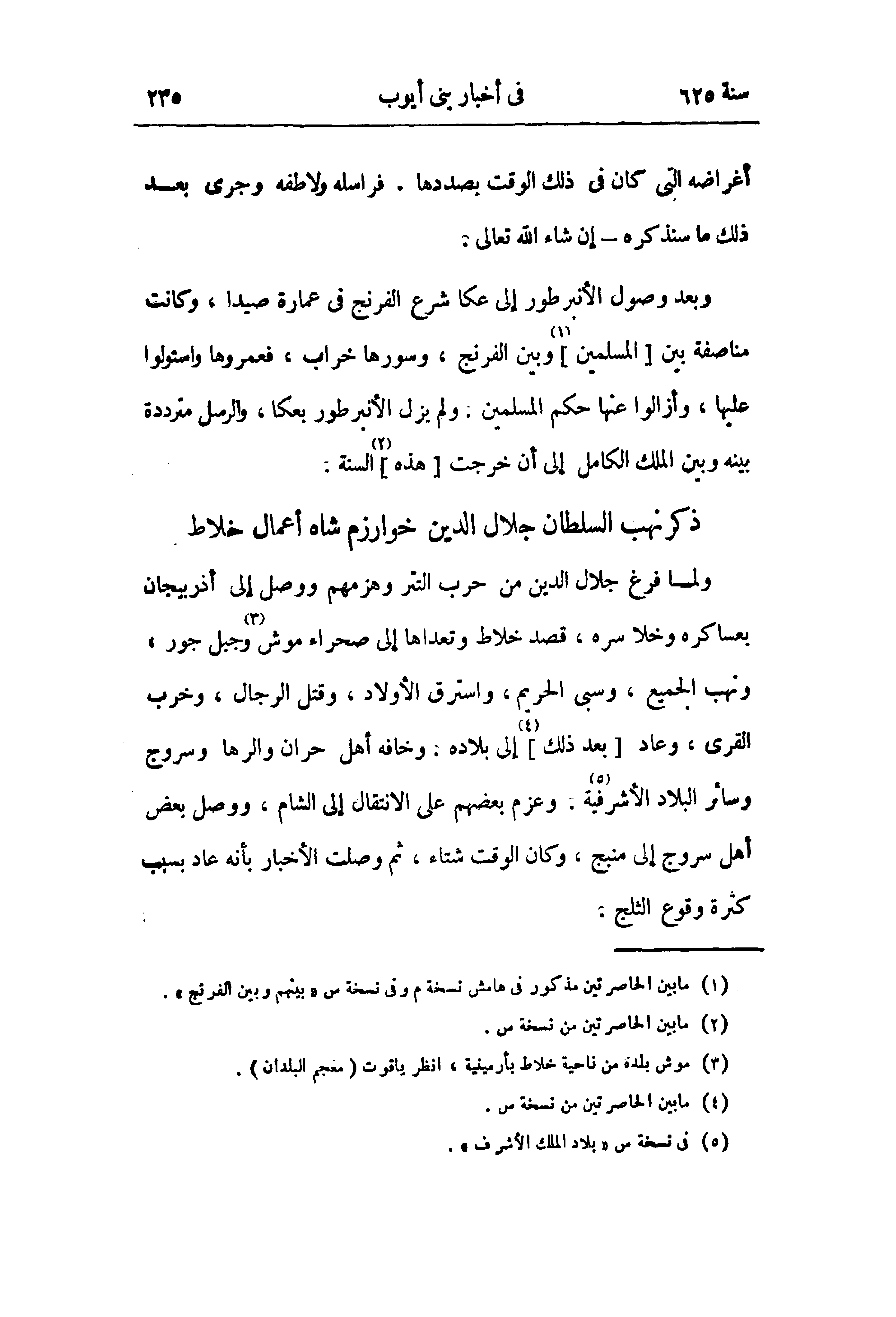ولما فرغ جلال الدين من حرب التتر وهزمهم ووصل إلى أذربيجان بعساكره وخلا سره، قصد خلاط وتعداها إلى صحراء موش (¬3) وجبل جور، ونهب الجميع، وسبى الحريم، واسترق الأولاد، وقتل الرجال، وخرب القرى، وعاد [بعد ذلك] (¬4) إلى بلاده. وخافه أهل حران والرها وسروج وسائر البلاد الأشرفية (¬5). وعزم بعضهم على الانتقال إلى الشام، ووصل بعض أهل سروج إلى منبج، وكان الوقت شتاء، ثم وصلت الأخبار بأنه عاد بسبب كثرة وقوع الثلج.