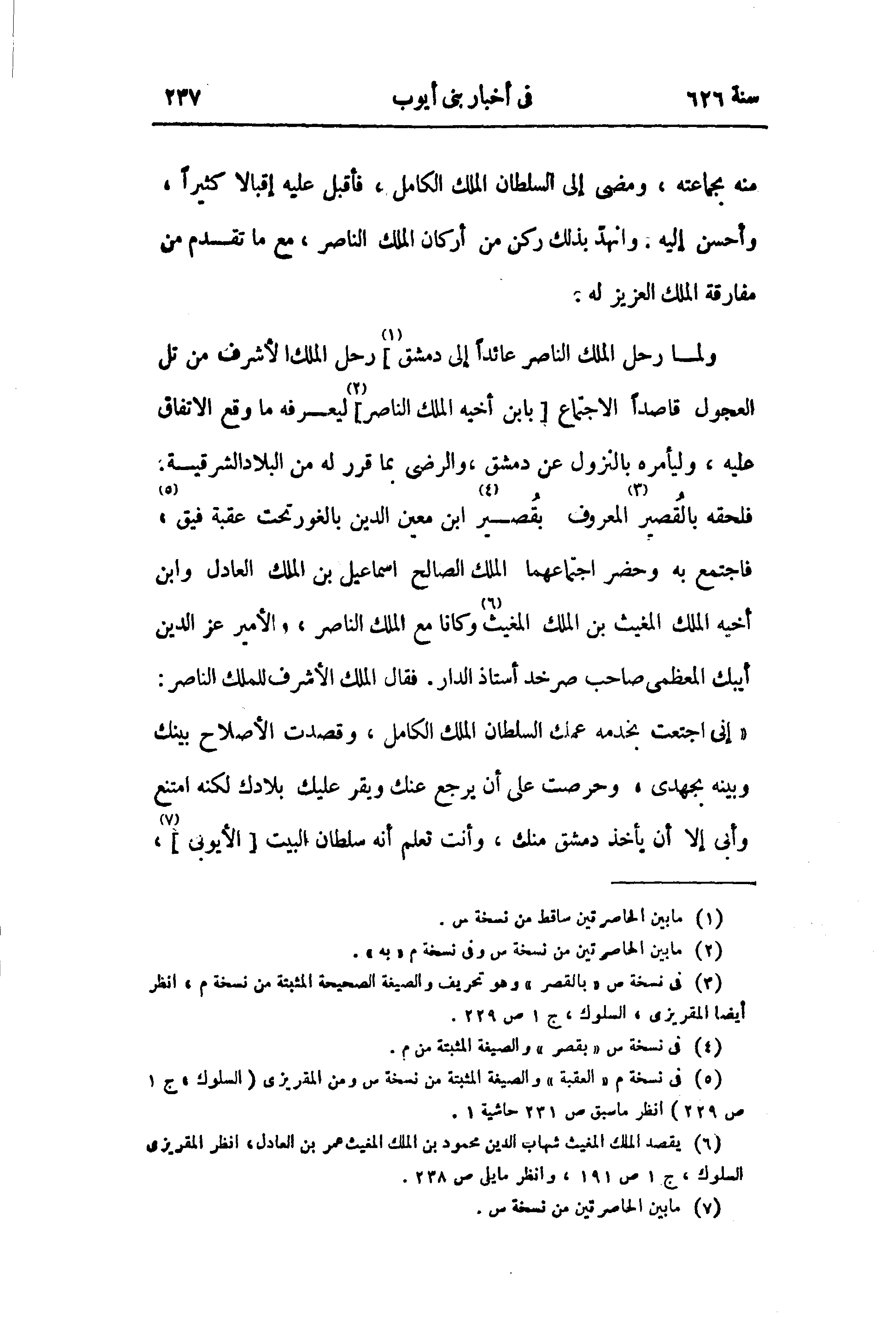 (¬6) يقصد الملك المغيث شهاب الدين محمود بن الملك المغيث عمر بن العادل، انظر المقريزى السلوك، ج 1 ص 191، وانظر ما يلى ص 238.