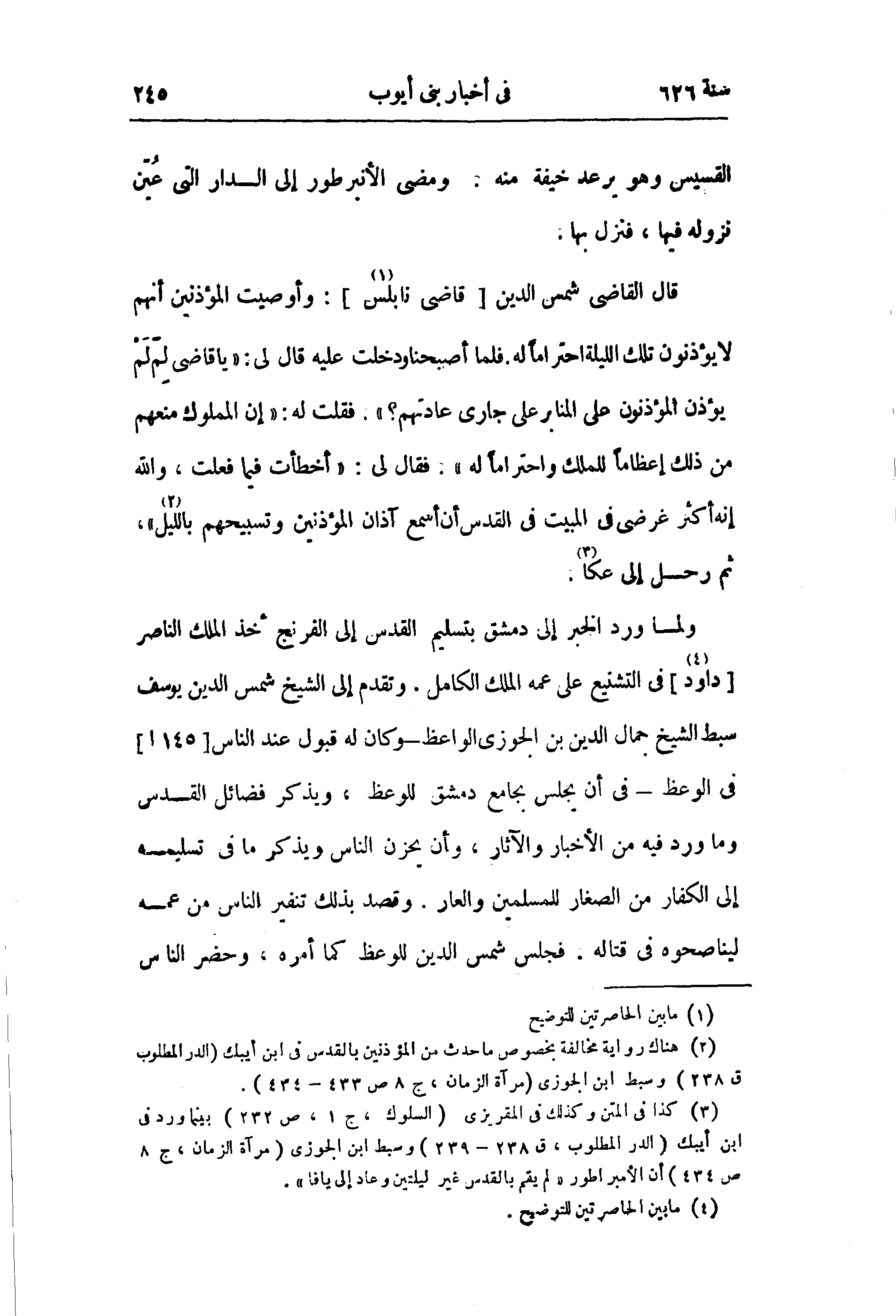 (¬2) هناك رواية مخالفة بخصوص ما حدث من المؤذنين بالقدس في ابن أيبك (الدر المطلوب ق 238) وسبط ابن الجوزى (مرآة الزمان، ج 8 ص 433 - 434).