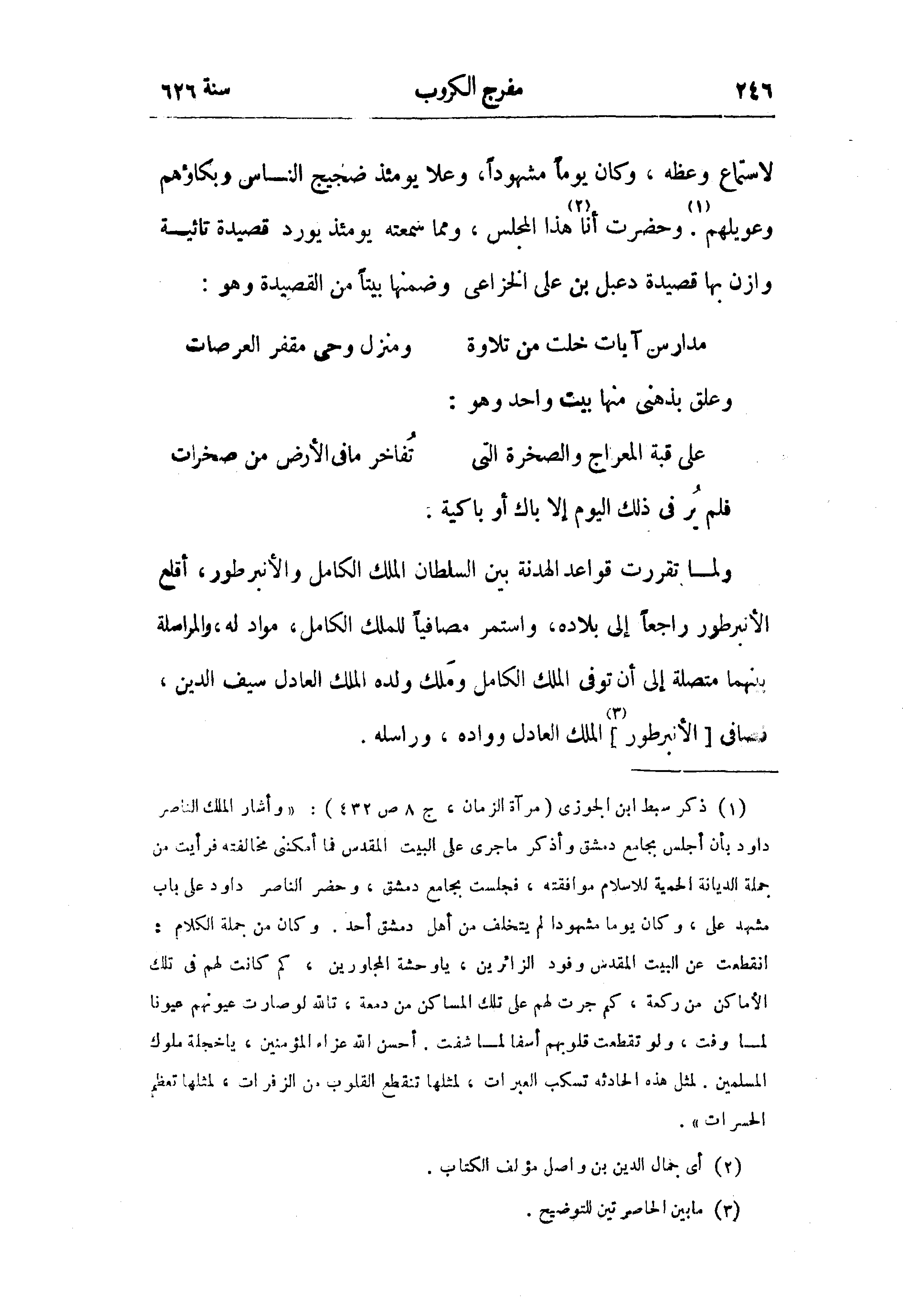(¬1) ذكر سبط ابن الجوزى (مرآة الزمان، ج 8 ص 432): «وأشار الملك الناصر داود بأن أجلس بجامع دمشق وأذكر ما جرى على البيت المقدس فما أمكننى مخالفته فرأيت من جملة الديانة الحمية للاسلام موافقته، فجلست بجامع دمشق، وحضر الناصر داود على باب مشهد على، وكان يوما مشهودا لم يتخلف من أهل دمشق أحد. وكان من جملة الكلام: انقطعت عن البيت المقدس وفود الزائرين، يا وحشة المجاورين، كم كانت لهم في تلك الأماكن من ركعة، كم جرت لهم على تلك المساكن من دمعة، تالله لو صارت عيونهم عيونا لما وفت، ولو تقطعت قلوبهم أسفا لما شفت. أحسن الله عزاء المؤمنين، يا خجلة ملوك المسلمين. لمثل هذه الحادثه تسكب العبرات، لمثلها تنقطع القلوب من الزفرات، لمثلها تعظم الحسرات».