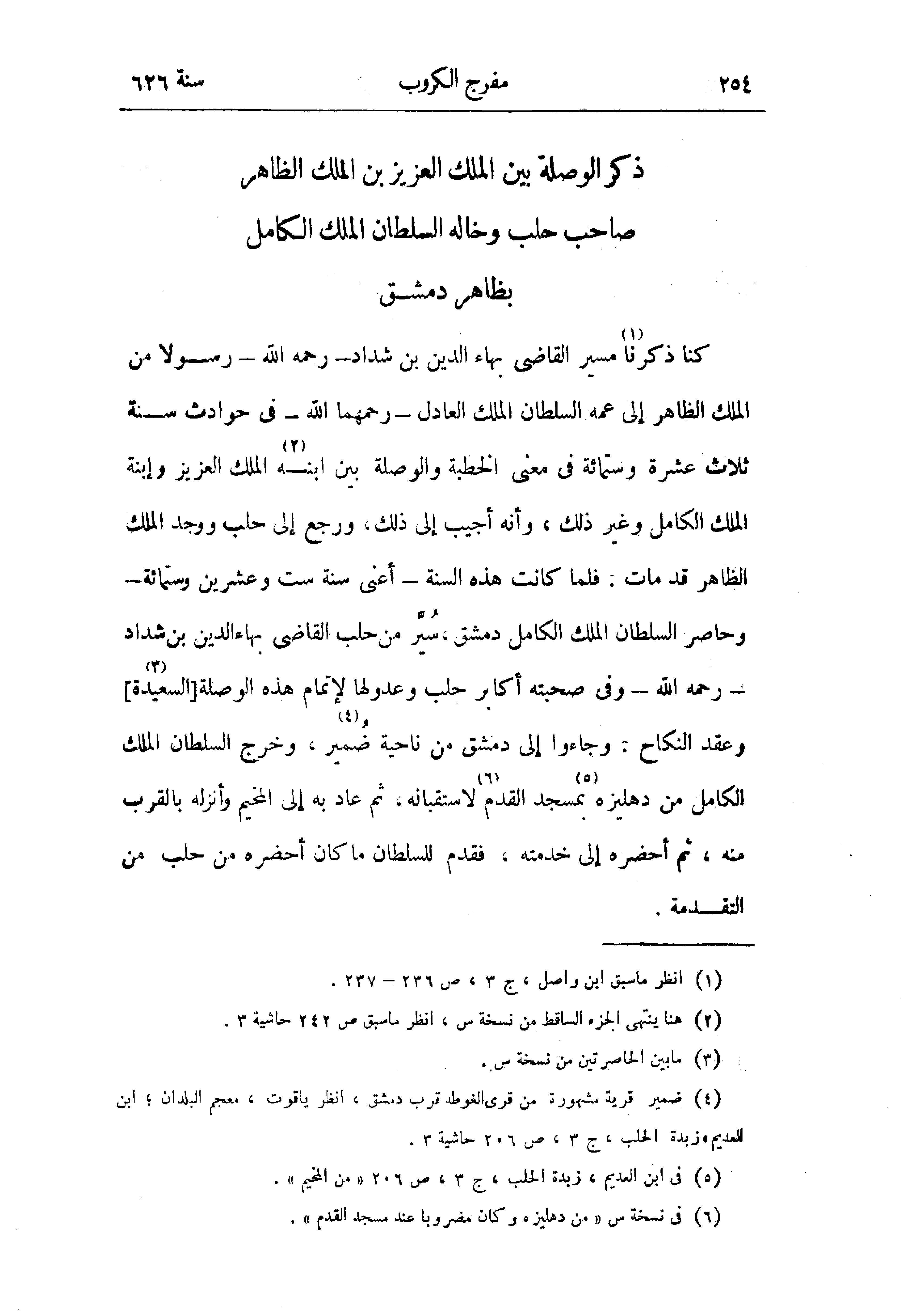 كنا ذكرنا (¬1) مسير القاضى بهاء الدين بن شداد - رحمه الله - رسولا من الملك الظاهر إلى عمه السلطان الملك العادل - رحمهما الله - في حوادث سنة ثلاث عشرة وستمائة في معنى الخطبة والوصلة بين ابنه (¬2) الملك العزيز وإبنة الملك الكامل وغير ذلك، وأنه أجيب إلى ذلك، ورجع إلى حلب ووجد الملك الظاهر قد مات. فلما كانت هذه السنة - أعنى سنة ست وعشرين وستمائة - وحاصر السلطان الملك الكامل دمشق، سيّر من حلب القاضى بهاء الدين بن شداد - رحمه الله - وفى صحبته أكابر حلب وعدولها لإتمام هذه الوصلة [السعيدة (¬3)] وعقد النكاح. وجاءوا إلى دمشق من ناحية ضمير (¬4)، وخرج السلطان الملك الكامل من دهليزه (¬5) بمسجد القدم (¬6) لاستقباله، ثم عاد به إلى المخيم وأنزله بالقرب منه، ثم أحضره إلى خدمته، فقدم للسلطان ما كان أحضره من حلب من التقدمة.