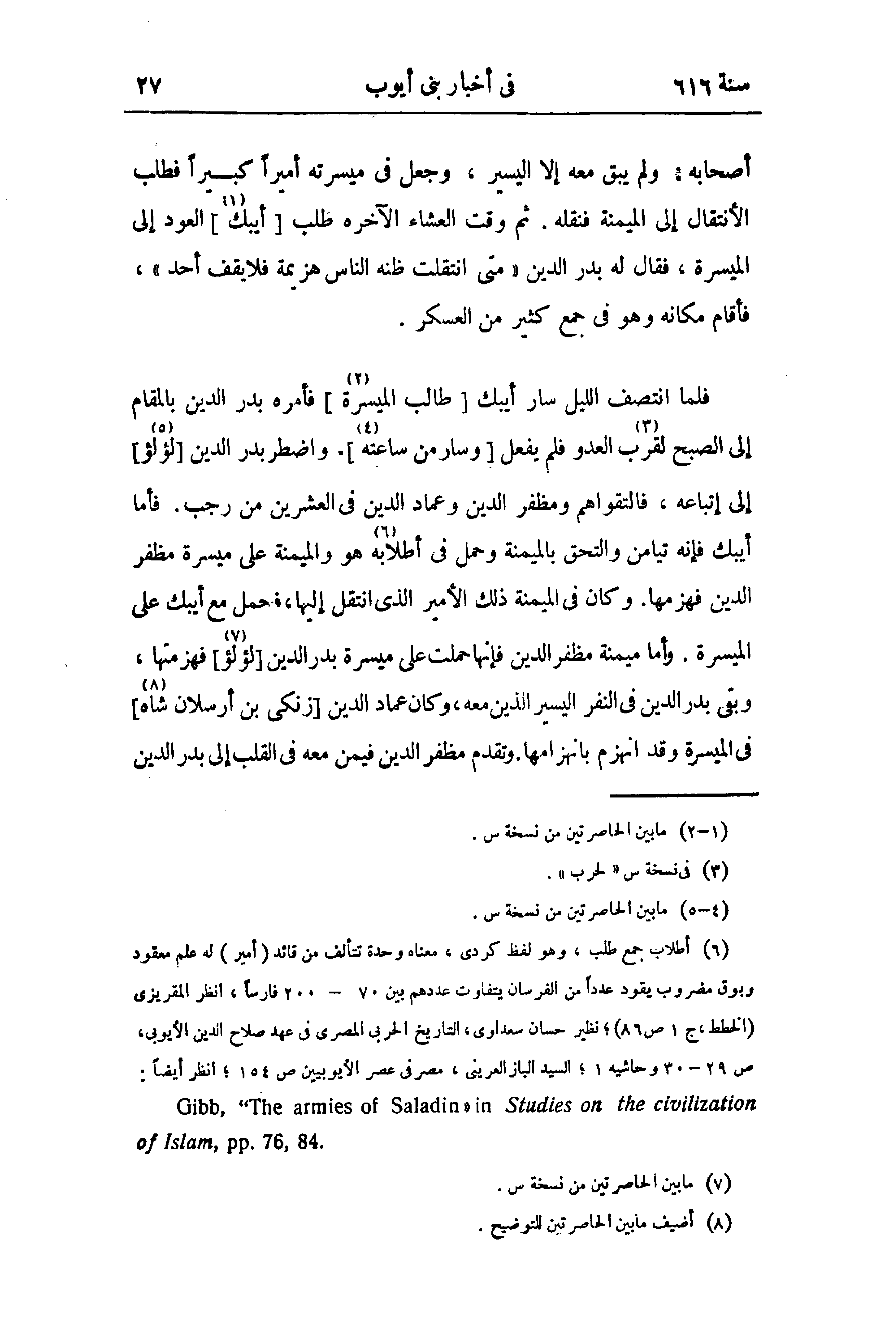 (¬6) أطلاب جمع طلب، وهو لفظ كردى، معناه وحدة تتألف من قائد (أمير) له علم معقود وبوق مضروب يقود عددا من الفرسان يتفاوت عددهم بين 70 - 200 فارسا، انظر المقريزى (الخطط، ج 1 ص 86)؛ نظير حسان سعداوى، التاريخ الحربى المصرى في عهد صلاح الدين الأيوبى، ص 29 - 30 وحاشيه 1؛ السيد الباز العرينى، مصر في عصر الأيوبيين ص 154؛ انظر أيضا Gibb, «The armies of Saladin» in Studies on the civilization of Islam,pp .76, 84.