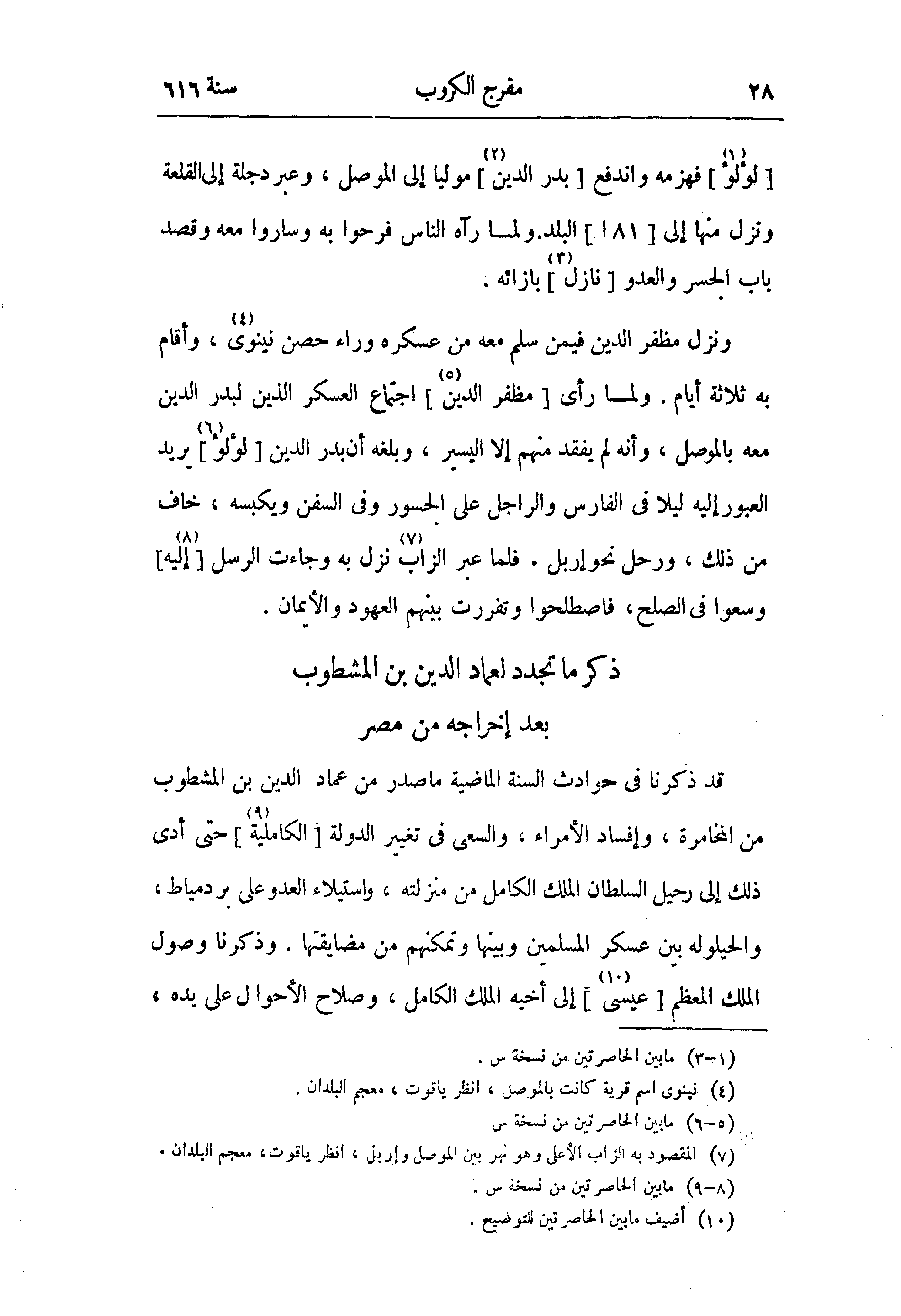 ونزل مظفر الدين فيمن سلم معه من عسكره وراء حصن نينوى (¬4)، وأقام به ثلاثة أيام. ولما رأى [مظفر الدين (¬5)] اجتماع العسكر الذين لبدر الدين معه بالموصل، وأنه لم يفقد منهم إلا اليسير، وبلغه أن بدر الدين [لؤلؤ] (¬6) يريد العبور إليه ليلا في الفارس والراجل على الجسور وفى السفن ويكبسه، خاف من ذلك، ورحل نحو إربل. فلما عبر الزاب (¬7) نزل به وجاءت الرسل [إليه] (¬8) وسعوا في الصلح، فاصطلحوا وتقررت بينهم العهود والأيمان.