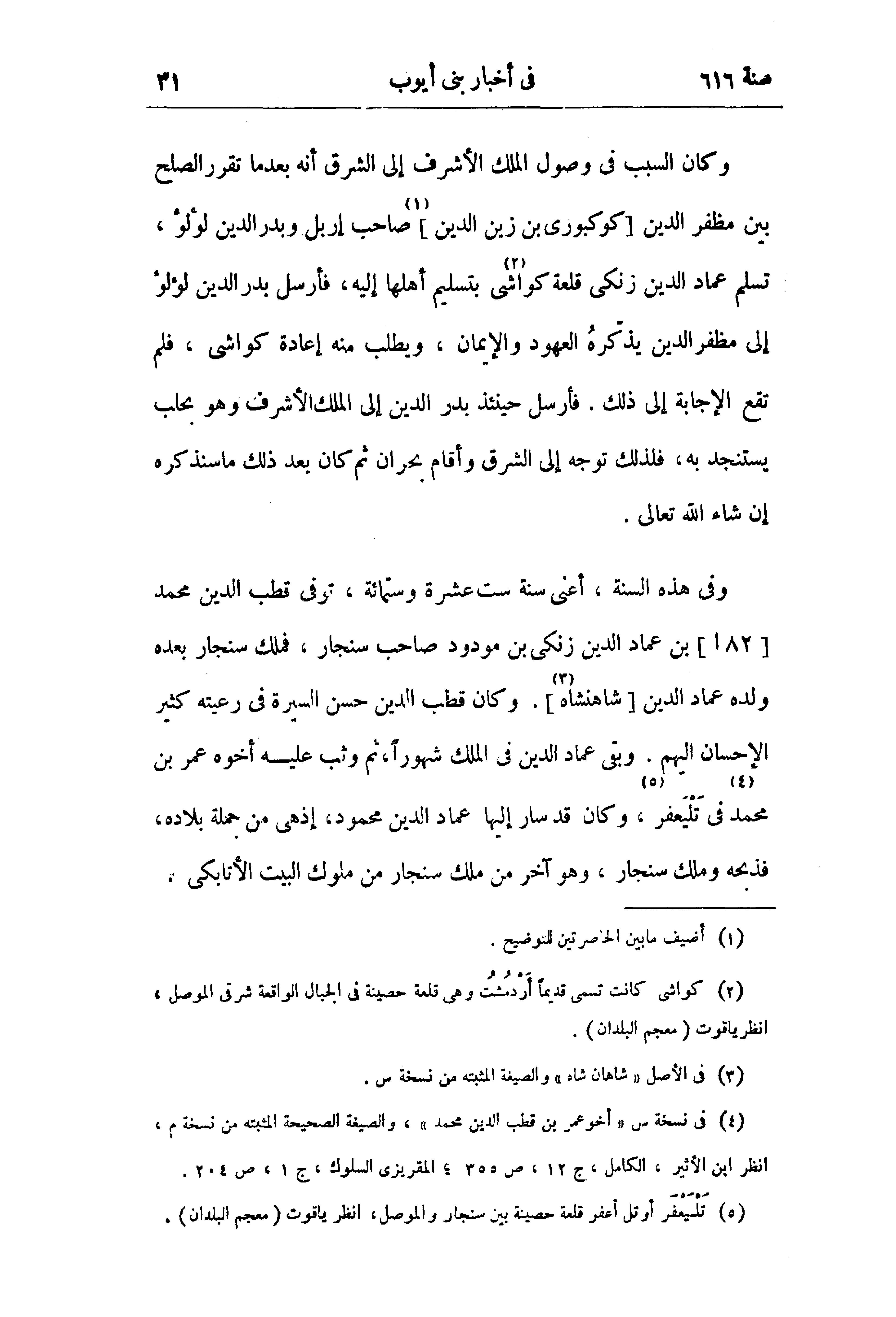 وفى هذه السنة، أعنى سنة ست عشرة وستمائة، توفى قطب الدين محمد [82 أ] بن عماد الدين زنكى بن مودود صاحب سنجار، فملك سنجار بعده ولده عماد الدين [شاهنشاه] (¬3). وكان قطب الدين حسن السيرة في رعيته كثير الإحسان اليهم. وبقى عماد الدين في الملك شهورا، ثم وثب عليه أخوه عمر بن محمد (¬4) في تليعفر (¬5)، وكان قد سار إليها عماد الدين محمود، إذهى من جملة بلاده، فذبحه وملك سنجار، وهو آخر من ملك سنجار من ملوك البيت الأتابكى.