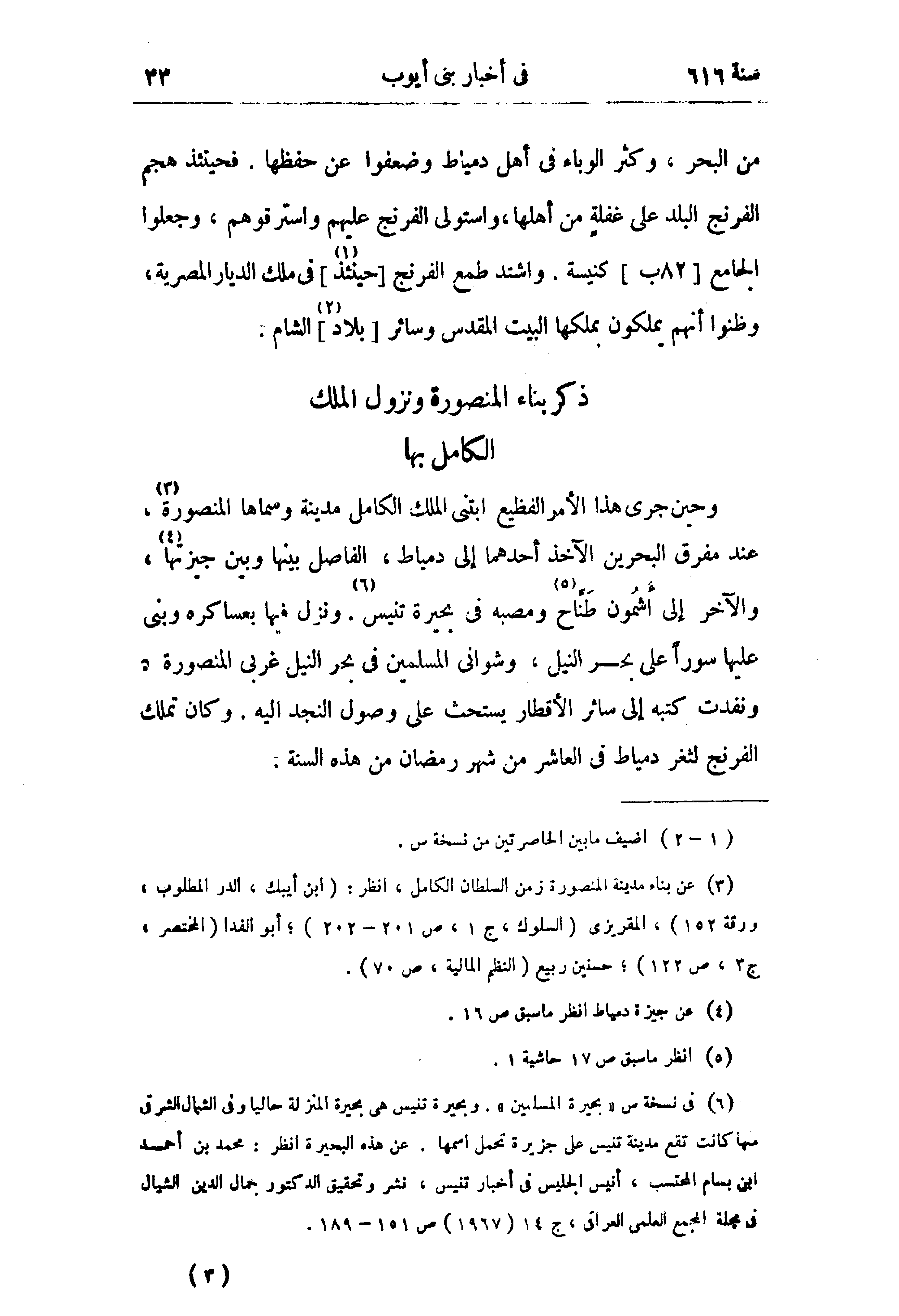 (¬3) عن بناء مدينة المنصورة زمن السلطان الكامل، انظر: (ابن أيبك، الدر المطلوب، ورقة 152)، المقريزى (السلوك، ج 1، ص 201 - 202)؛ أبو الفدا (المختصر، ج 3، ص 122)؛ حسنين ربيع (النظم المالية، ص 70).