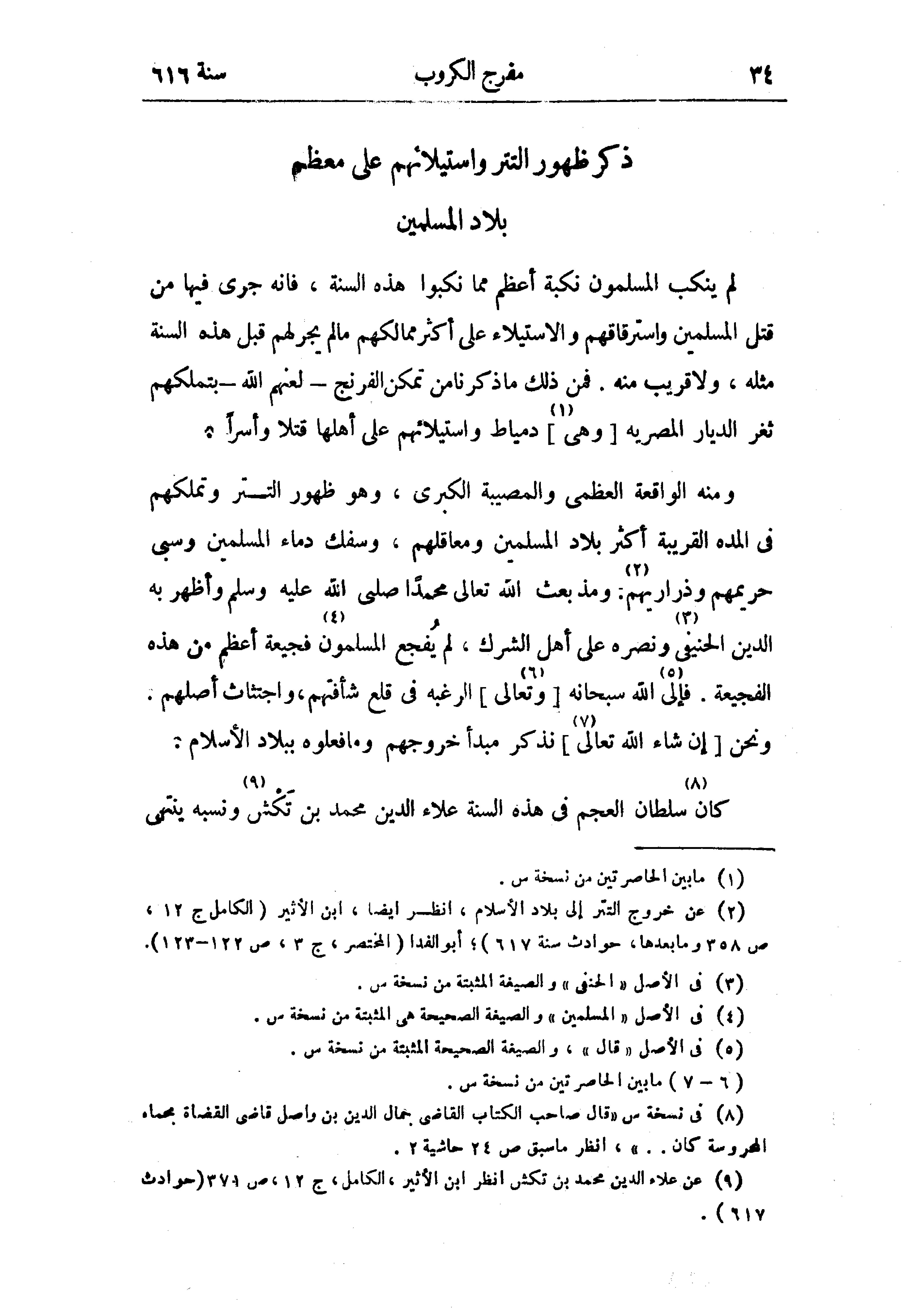 (¬2) عن خروج التتر إلى بلاد الأسلام، انظر ايضا، ابن الأثير (الكامل ج 12، ص 358 وما بعدها، حوادث سنة 617)؛ أبو الفدا (المختصر، ج 3، ص 122 - 123).