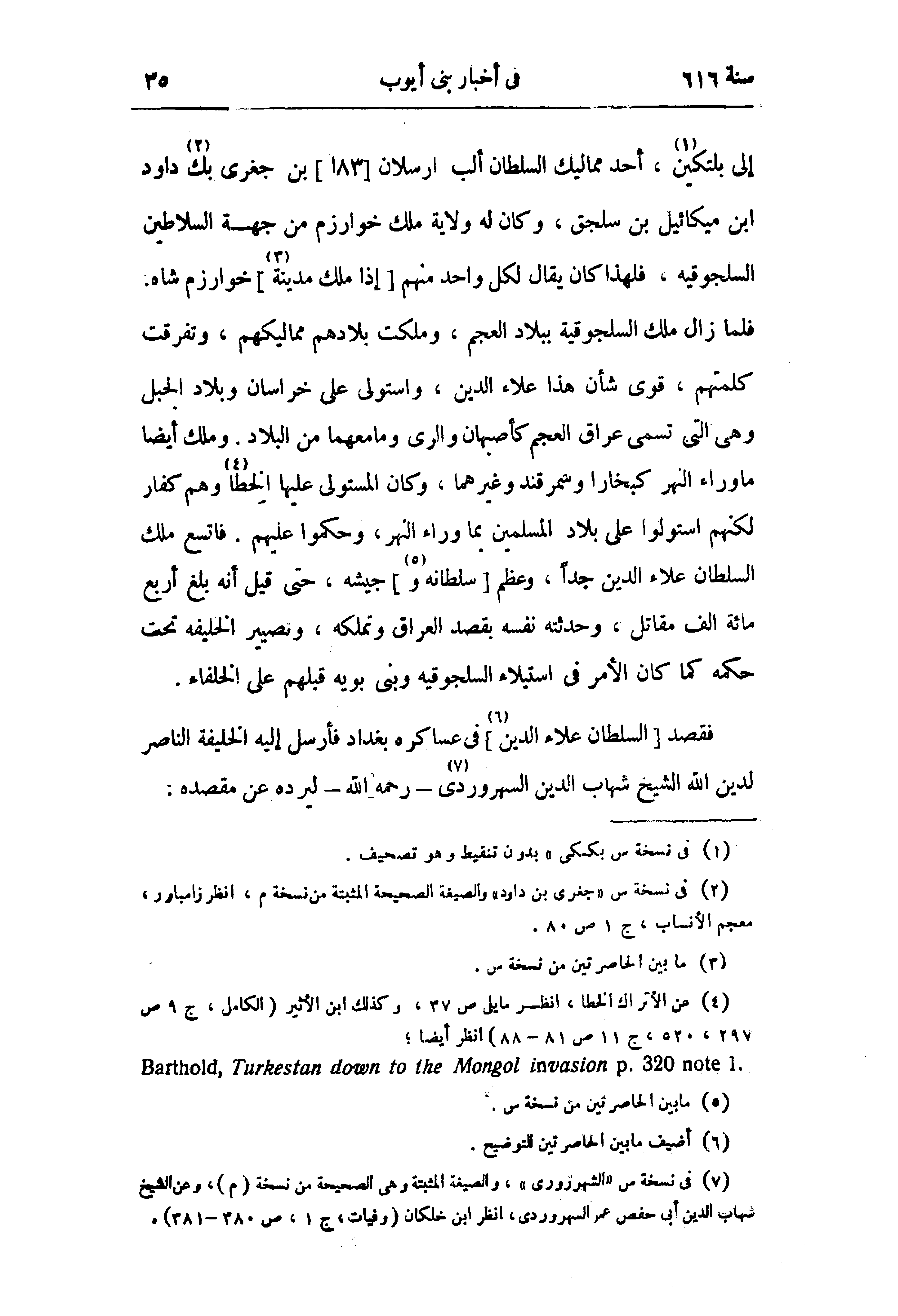(¬4) عن الأتراك الخطا، انظر مايلى ص 37، وكذلك ابن الأثير (الكامل، ج 9 ص 297، 520، ج 11 ص 81 - 88) انظر أيضا: Barthold,Turkestan down to the Mongol invasion P. 230 note 1 .